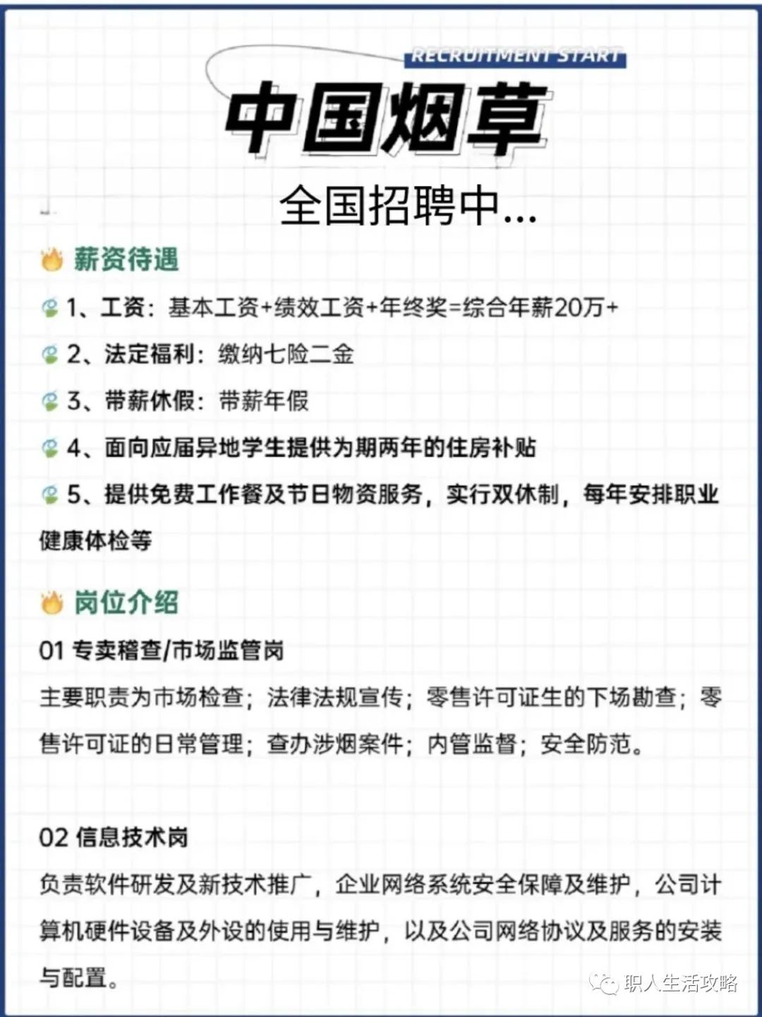 目前中国烟草正在大规模招聘,不同的烟草专卖局对应的招聘条件不一样,部分招聘大专就可以报考,需要查看具体招聘公告,看看自己是否符合。多岗位可选!多专业可报!应往届可报!无四六级要求,入职就是正式工,年薪20万不是梦.