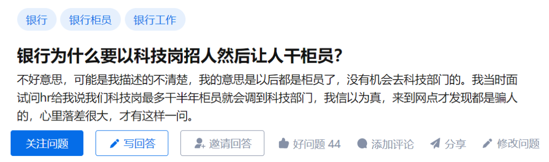 第二,银行确实骗人了。而这源于两方面原因,一方面是因为柜员流失率高,所以银行需要不断的招聘新人,弥补人员流失;另一方面银行柜员又招不来人,尤其是高学历、名校的学生,如果银行在招聘公告中说明是柜员,那无疑最终报名的都是学校学历很一般的学生。所以这几年各家银行都学聪明了,在招聘时各种其他名义招聘,比如运营岗,科技岗,管培生等等。等招进来以后,就以新员工必须先从柜台开始熟悉业务为理由,把你放到柜台上,从此遥遥无期。甚至有银行为了招揽双一流高校的学子,会以总行或者省分行的名义招聘,招进来以后放下去当柜员。