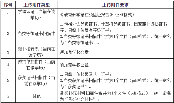 3.上传应聘附件材料。应聘毕业生通过招聘平台及时、规范上传个人应聘附件材料,上传附件数量不超过7个。应聘毕业生应确保应聘材料能正常打开、清晰显示,因应聘材料不能正常打开、图像不清晰或未按规范要求填报导致的结果由应聘者本人承担。上传附件具体要求如下: