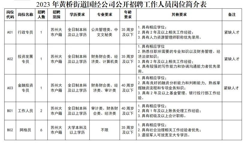 1.岗位年龄要求40周岁及以下的,即1983年11月6日以后出生,岗位年龄要求35周岁及以下的,即1988年11月6日以后出生。(年龄要求详见《2023年黄桥街道国经公司公开招聘工作人员岗位简介表》)