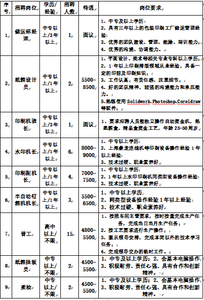岗位:储运部经理、纸箱设计员、印刷机班长、水印机长、印刷副机长、半自动钉箱机机长、普工、纸箱挂板员、质检