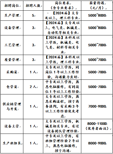 岗位:生产管理、设备管理、工艺管理、质量管理、采购员、仓管员、供应链管理与开发、设备主管、生产班组长
