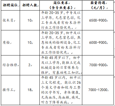 岗位:技术员、质检、综合维修、操作工