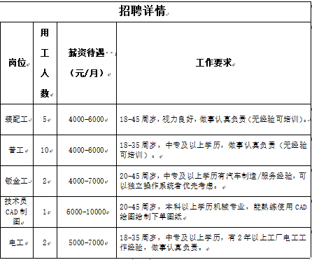 岗位:装配工、普工、钣金工、技术员CAD制图、电工