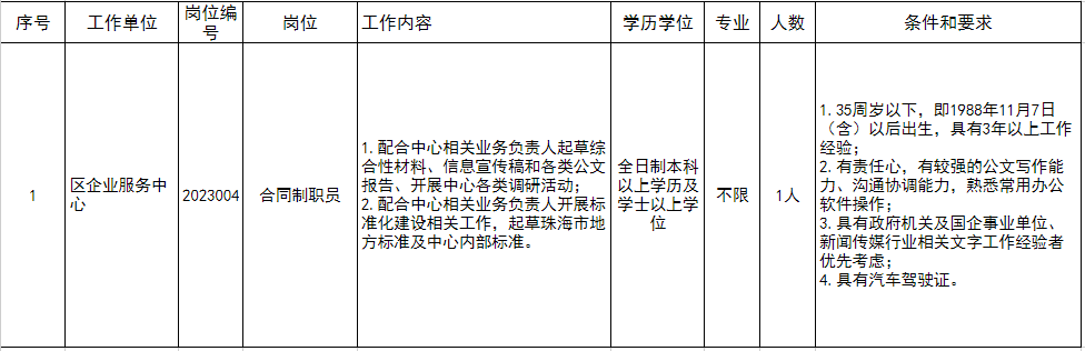 4.其他条件见《珠海高新区企业服务中心公开招聘合同制职员岗位一览表》;