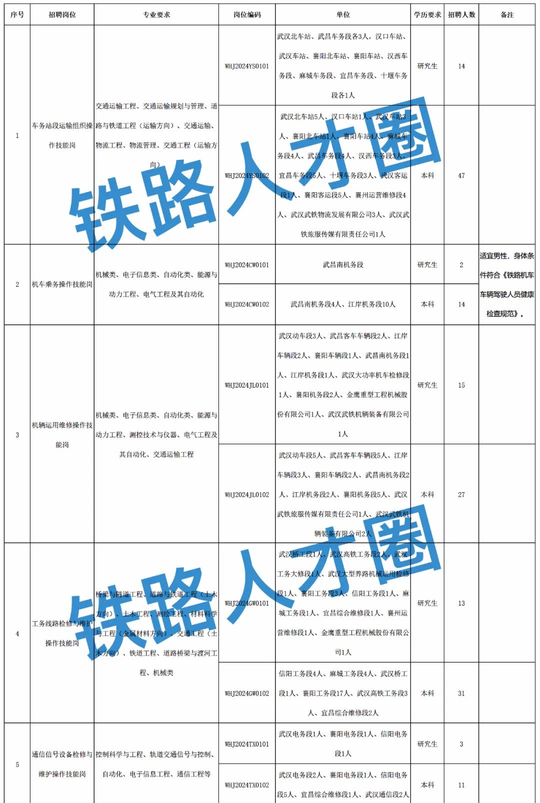 相关招聘公告(点击红字查看详情): 1、中国铁路武汉局集团有限公司历年招聘汇总 2、各大铁路局报名常见问题的答案都在这里了!(点击查看) 3、图文详解!铁路局招聘报名流程详解2022版(点击查看) 4、铁路局面试备考技巧(点击查看) 5、学信网学籍在线验证报告下载流程(铁路局招聘报名必备) 278人!中国铁路武汉局集团有限公司 2024年招聘高校毕业生公告(一) 中国铁路武汉局集团有限公司根据经营发展需求,拟招聘普通高等院校本科及以上学历毕业生,现将有关事项公告如
