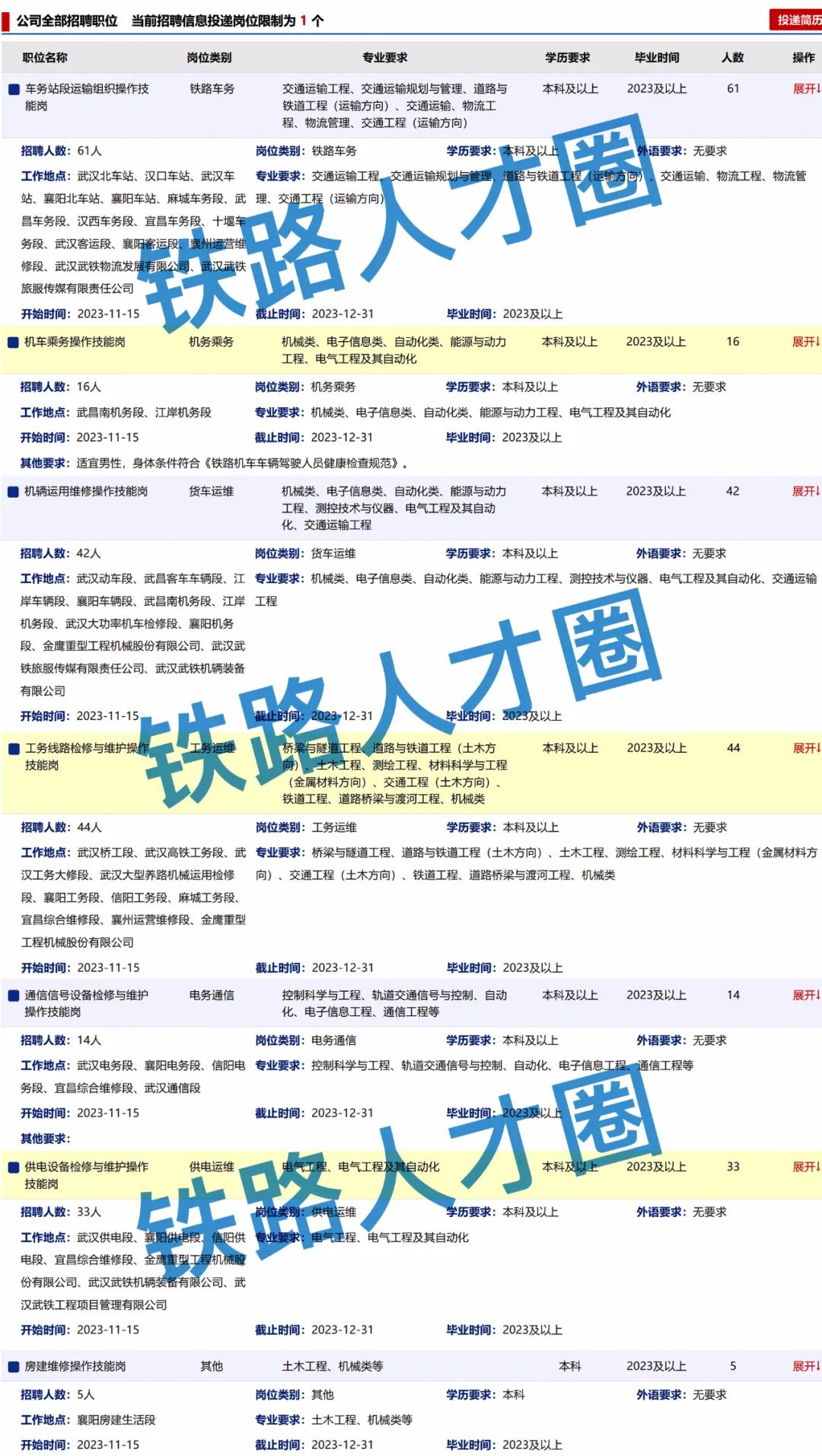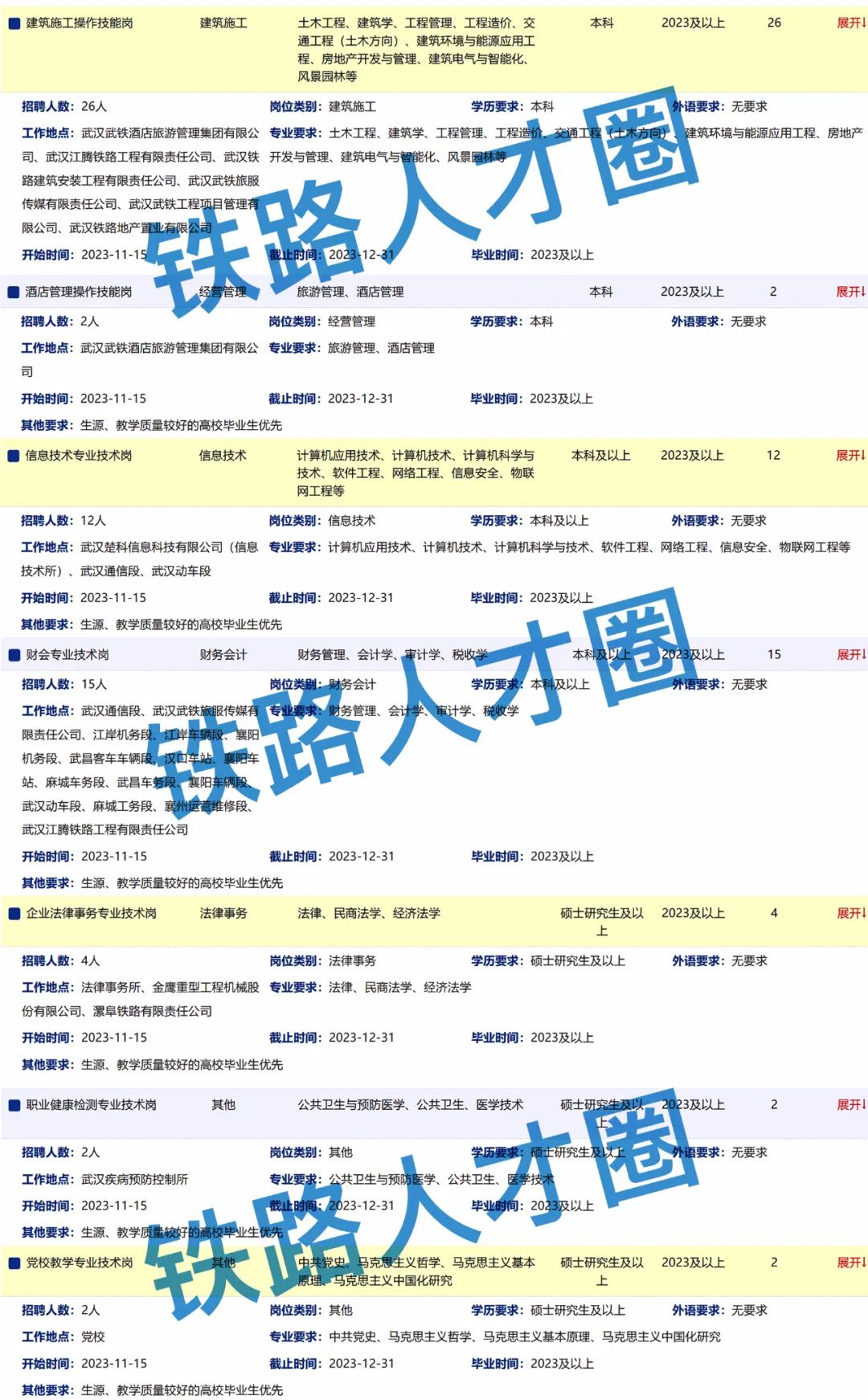 咨询时间:报名期间工作日9:00-11:00 15:00-17:00 中国铁路武汉局集团有限公司人事部 2023年11月15日 各大地铁公司招聘公告!专科及以上均可报名 京港地铁2023年11月招聘公告! 全国18家铁路局集团有限公司历年招聘汇总 铁路局2024年招聘公告!正式工8000人! 1. 商务合作:请添加:mobanche22 2. 全国地铁/铁路应聘者交流群!加入方式:关注公众号后,请向公众号菜单栏发送“应聘交流群”加入交流群