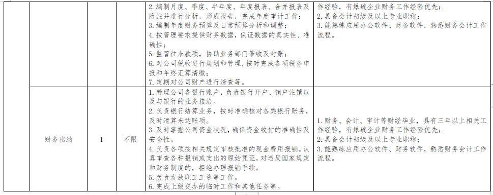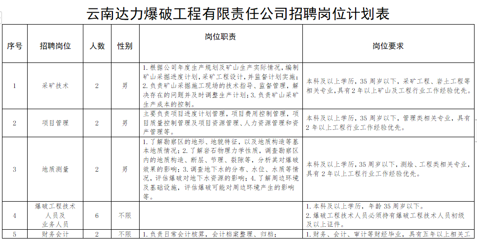 招聘岗位 招聘15个岗位,采矿技术2人,项目管理2人,地质测量2人,财务3人(出纳1人、会计2人),爆破工程技术人员、业务人员6人。
