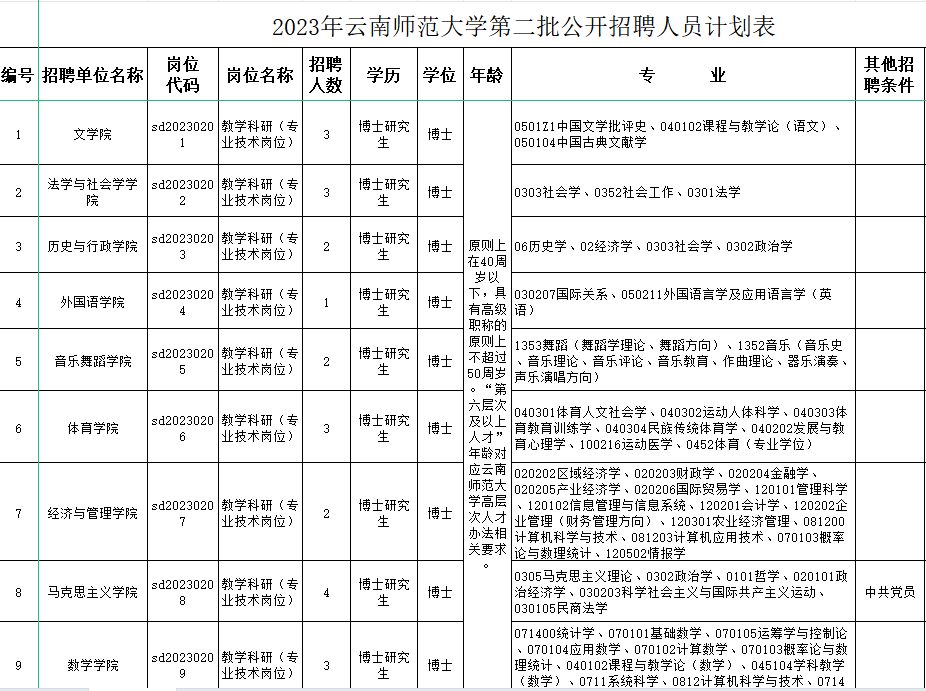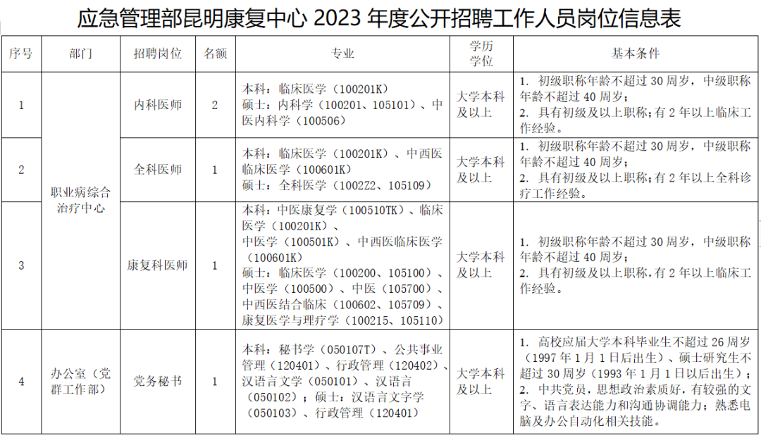 图源:云南人才网 资格条件 (一)具有中华人民共和国国籍,遵守宪法和法律,品行端正; (二)拥护中国共产党领导和社会主义制度,政治立场坚定,增强“四个意识”,坚定“四个自信”,做到“两个维护”,自觉在思想上政治上行动上同以习近平同志为核心的党中央保持高度一致; (三)热爱应急管理事业及机关后勤服务保障工作; (四)具备岗位所需的基本素质、专业技能和身体条件; (五)符合岗位所需要的其他资格条件,详见岗位信息表; (六)有以下情形之一者不得报考: 1.受过刑事处罚、开除党籍或学籍,及其他党纪行政处分的; 2.正在接受纪律审查或涉嫌违法犯罪正在接受调查的; 3.被依法列入失信联合惩戒对象名单的; 4.在国家法定考试、各级公务员及事业单位招考中被认定有舞弊等严重违反考试录用纪律行为还在禁考期的; 5.聘用后构成回避关系的; 6.法律法规规定不得聘用为事业单位工作人员的其他情形的。 网上报名时间:2023年11月20日至11月22日18时; 岗位待遇 本次公开招聘的工作人员,正式聘用后纳入事业单位编制内管理,其管理和待遇按照应急管理部和应急管理部昆明康复中心相关规定执行。 报名入口:关注【昆明本地宝】微信公众号,点击发消息,在聊天对话框发送【招聘】即可获取报名入口; 招聘岗位 云南师范大学第二批公开招聘工作人员42名。具体招聘岗位及招聘条件,详见《2023年云南师范大学第二批公开招聘人员计划表》(附件1)。