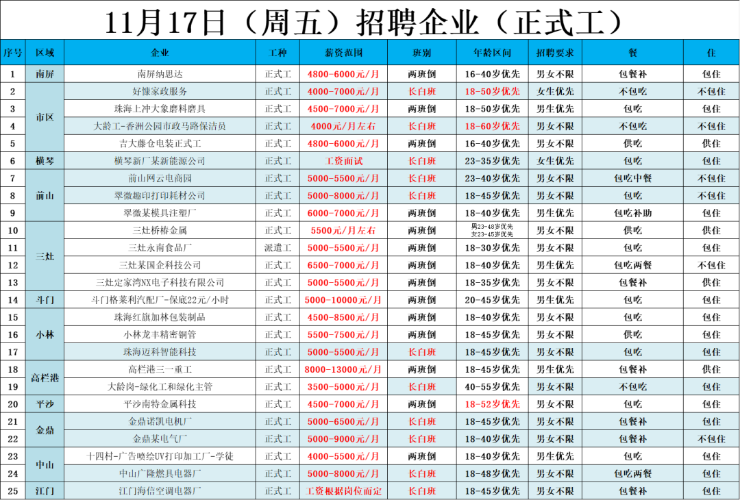 常白班,包住(有夫妻房)不包吃 3500-5000元/月,6天8小时制 二个地点自选一、横琴或二、高栏港中海油附近