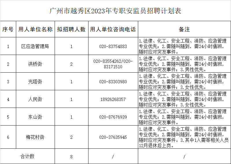 越秀11月招聘上新! 越秀区应急管理局、华乐街等单位招人 看看有没有你心水的岗位~ ↓↓↓ 面向社会公开招聘8名专职安监员,具体岗位如下: