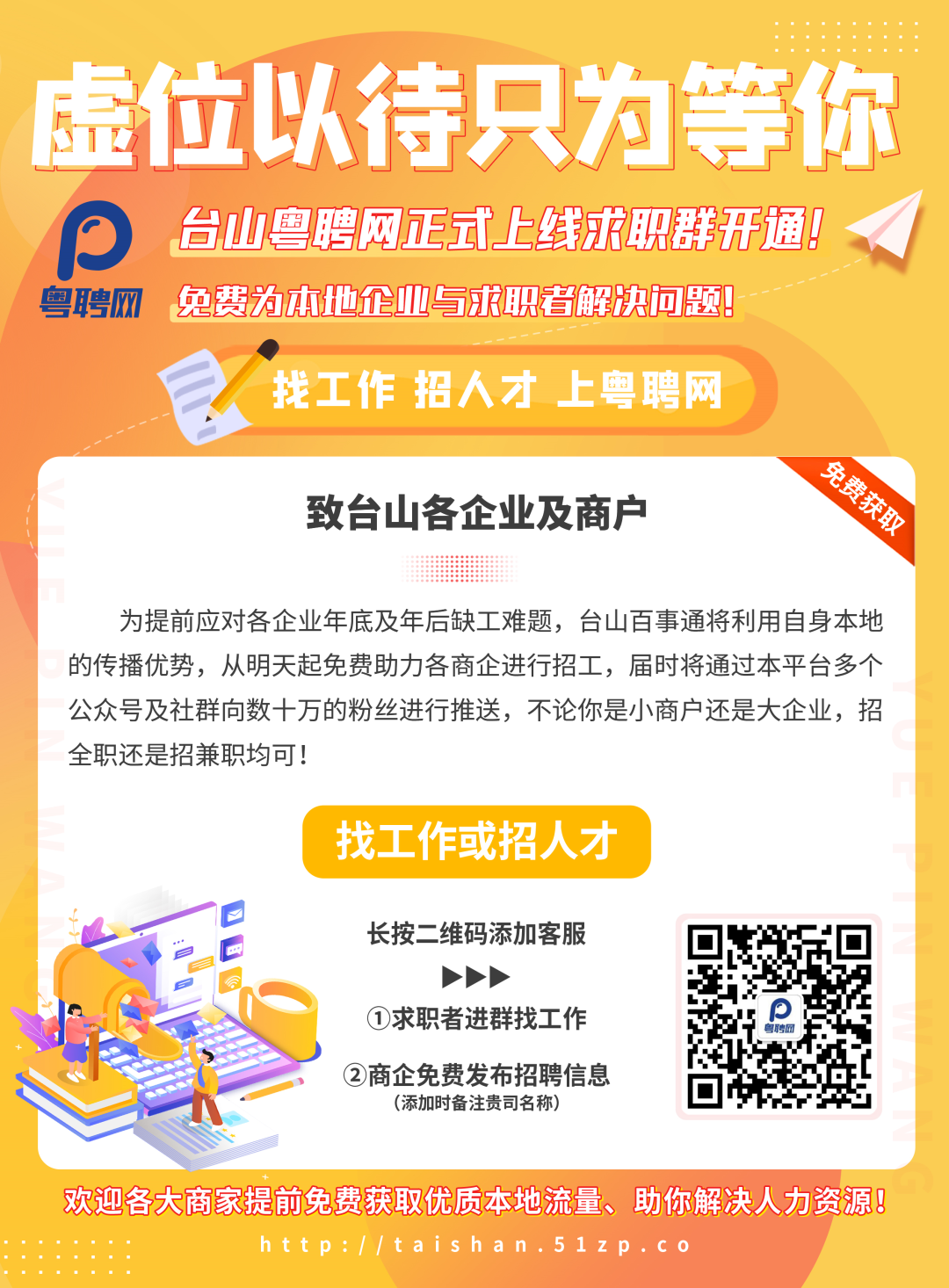 免责声明:以上信息是由本地台山粤聘网用户自行发布,所有内容均由发布者对信息的真实性负责,台山粤聘网及本公众号平台仅提供信息发布、展示。