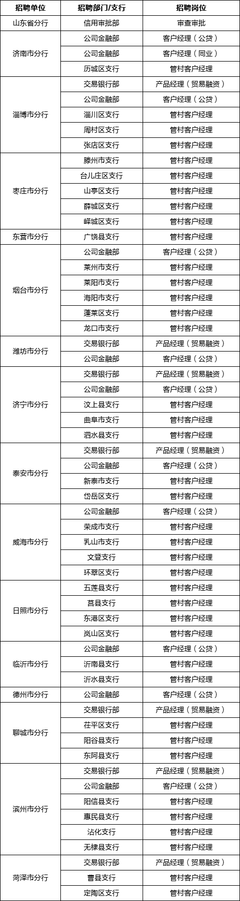 (以下是公告节选) 为推动山东省分行实现高质量发展,我行现启动2023年社会招聘,热忱邀请有志之士加盟,共同书写辉煌篇章。 一、招聘岗位 (一)省行专业类岗位 (二)市行专业类、销售类岗位 ![]() 二、招聘条件 (一)遵纪守法,诚实守信,身体健康,具有良好的个人品质和职业道德,有强烈的事业心和责任感,无不良从业记录;熟悉银行业务和相关法律法规,具备较高专业知识水平以及组织管理、沟通协调和适应环境等能力;符合我行履职回避管理办法相关规定要求。 (二)年龄要求。原则上应聘专业类、销售类人员年龄35周岁(含)以下。 (三)学历要求。国民教育系列全日制大学本科及以上学历学位,留学人员应取得教育部留学服务中心的学历学位认证。 (四)工作年限要求。应具有三年及以上相关岗位工作经验,近三年来更换工作单位不超过两个。 (五)相关年限时间计算截至2023年11月26日。 (以下是公告节选) 邮储银行湖南省分行始终坚持服务“三农”、城乡居民和中小企业的市场定位,以服务实体经济为己任,获得省政府金融支持地方经济发展一等奖、全国“五一劳动奖状”、2020—2021全国金融系统思想政治工作优秀单位、全国交通运输党建文化建设优秀单位。 一、招聘机构 省分行本部、省分行直属支行、长沙市分行、株洲市分行、湘潭市分行、衡阳市分行、邵阳市分行、岳阳市分行、常德市分行、益阳市分行、郴州市分行、永州市分行、娄底市分行、湘西州分行。 二、招聘岗位