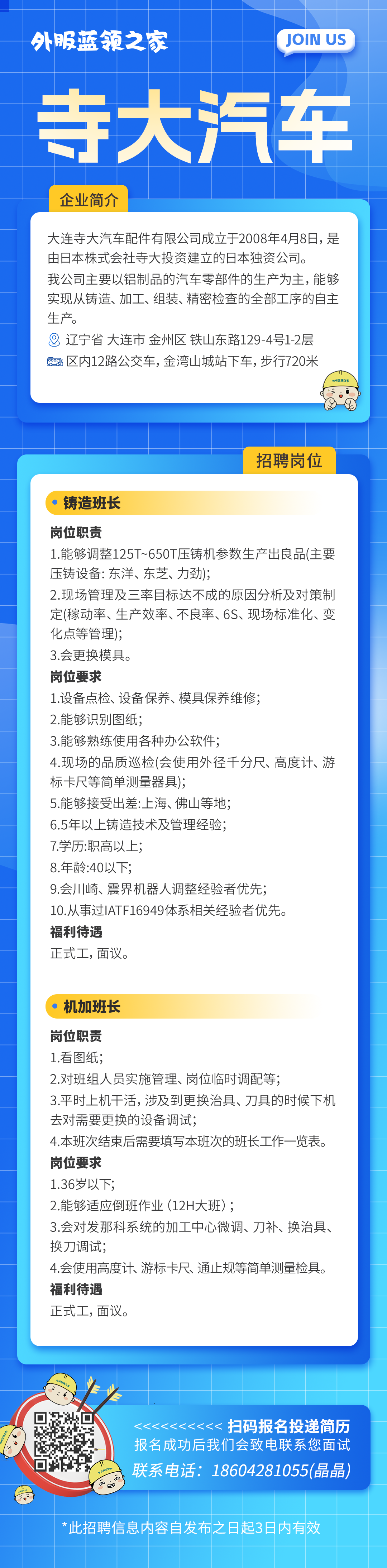 【寺大汽车】招聘机加班长,铸造班长等正式工合同,发展空间大,看好砸简历!
