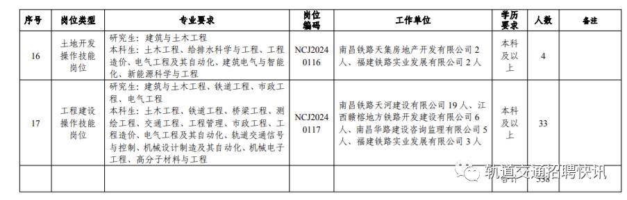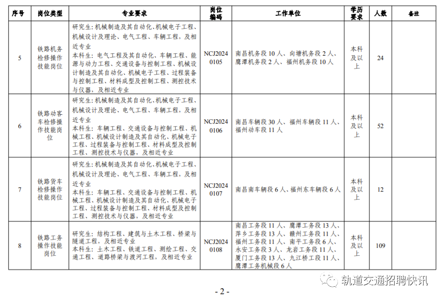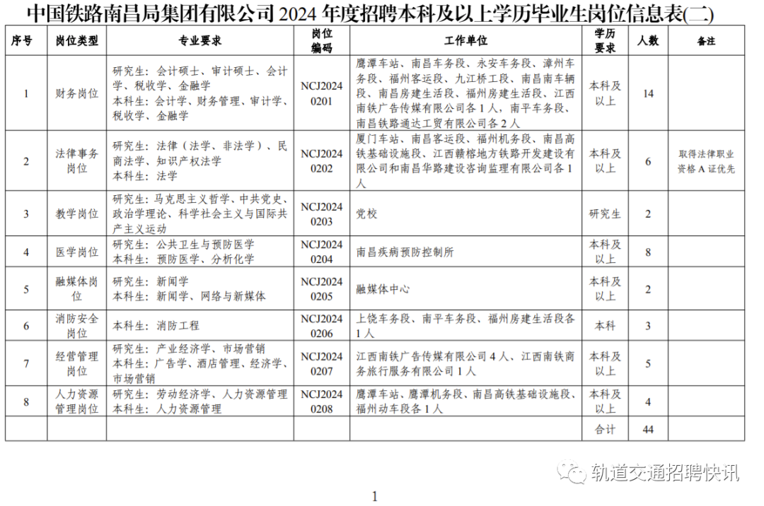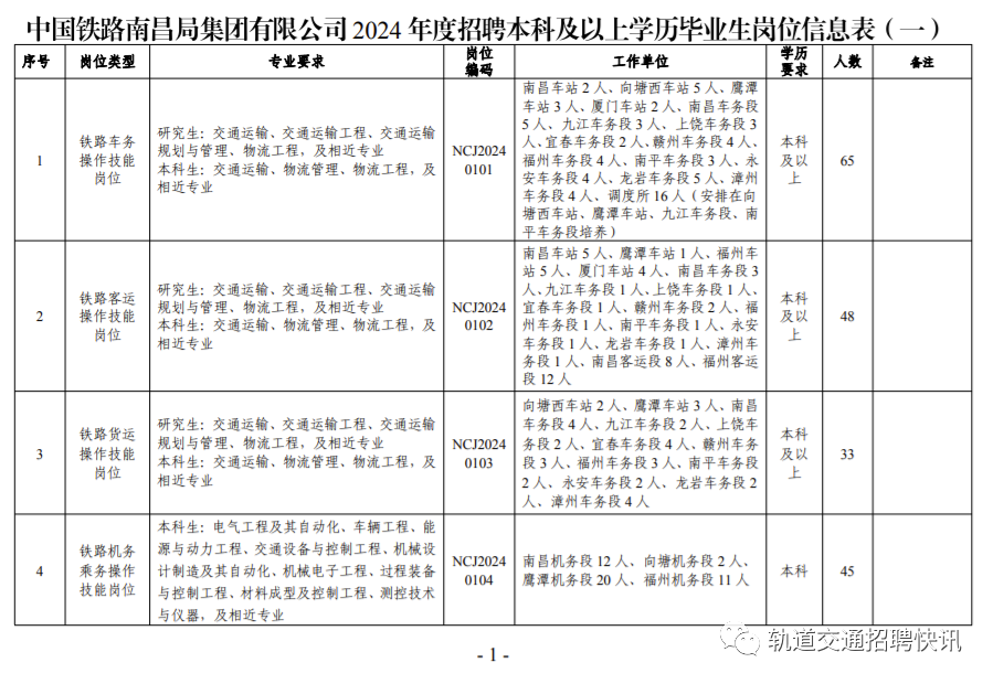 三、招聘流程 1.网上报名。报名采取网上报名方式,报名时间为2023年11月16 日至2024年3月31日。有意应聘的毕业生在规定时间内 进行报名,申请岗位时选择“中国铁路南昌局集团有限公司2024年度招聘本科及以上学历毕业生公告(一)”所对应的岗位,每人限报1个岗位。毕业生本人如实填写所有报名信息,真实、准确、完整上传毕业生就业推荐表、成绩单、学籍在线验证报告等电子附件,生成打印《毕业生应聘登记表》。 2.资格审查。根据招聘岗位要求,对应聘材料进行审核,择优筛选符合岗位要求的毕业生参加后续考试考核。未进入考试考核环节的毕业生不另行通知。 3.考试考核。以面试考核方式为主,接到通知的毕业生按指定时间、地点参加,否则视为放弃应聘。根据考核结果择优确定拟录用人选。 4.公示录用。拟录用人选通过中国铁路人才招聘网进行不少于7天的公示。公示期满无异议的,办理录用手续。 四、其他事项 1.本次招聘仅接受应聘人员本人在报名期间通过中国铁路人才招聘网报名,无其他报名方式,不接受邮寄、他人代交简历或电子邮箱发送简历。 2.应聘毕业生在招聘期间须保持通信畅通,凡未在规定时间内回复我公司通知、未按规定时间、地点和要求参加各招聘环节的,视为本人自动放弃。 3.所有信息须由毕业生本人如实填报,如发现网上填报及上传信息与实际信息不一致或弄虚作假的,取消应聘资格。 4.中国铁路南昌局集团有限公司不委托第三方招聘,不向应聘者收取任何费用,不指定辅导用书,不举办也不委托任何机构举办任何形式辅导培训班,请提高警惕,谨防受骗。 5.参加现场资格审核、考试考核时应聘人员须携带以下材料原件及复印件,材料用抽杆夹按顺序装订。 ⑴经本人签字确认的《毕业生应聘登记表》(报名网站下载打印); ⑵身份证,毕业生就业推荐表(加盖学校就业部门公章)、成绩单(加盖学校教务部门公章),教育部学籍在线验证报告(学信网按提示下载); ⑶体检报告。六个月内二级甲等及以上医院常规项目体检(血压、辨色力、视力、听力、心电图、胸片、血常规、尿常规、肝功能、肾功能为必检项目,须有体检结论); ⑷各种能够证明本人资历或能力的证书材料等。 6.中国铁路南昌局集团有限公司人事部保留对本招聘公告的最终解释权。 7.咨询电话:0791-87021951;咨询时间:工作日上午8:30-11:30,下午14:30-17:30。 中国铁路南昌局集团有限公司人事部 2023年11月16 日 44人!中国铁路南昌局集团有限公司 2024年度招聘本科及以上学历毕业生公告(二) 中国铁路南昌局集团有限公司根据企业发展需要,拟招聘普通高等院校本科及以上学历毕业生,现将有关事项公告如下: 一、招聘计划 本次计划招聘44人,招聘专业、岗位、人数和工作单位等内容详见附件。 二、招聘条件 1.列入国家招生计划的普通高等院校应届研究生、全日制普通高等院校应届本科毕业生,或经教育部学历认证的应届本科及以上学历留学生; 2.遵纪守法,品行端正,热爱铁路事业; 3.学习成绩优良,专业、学历等符合招聘岗位要求; 4.身心健康,身体条件符合招聘岗位要求; 5.素质能力符合招聘岗位工作要求,服从企业对岗位的安排和调整; 6. 优质高校优先。