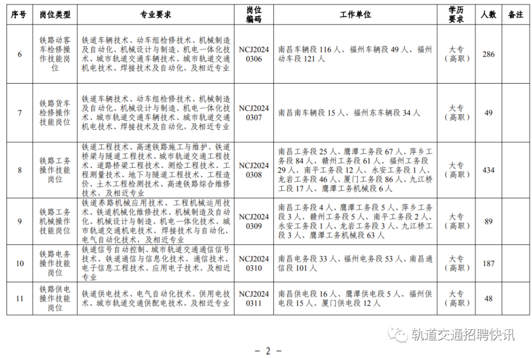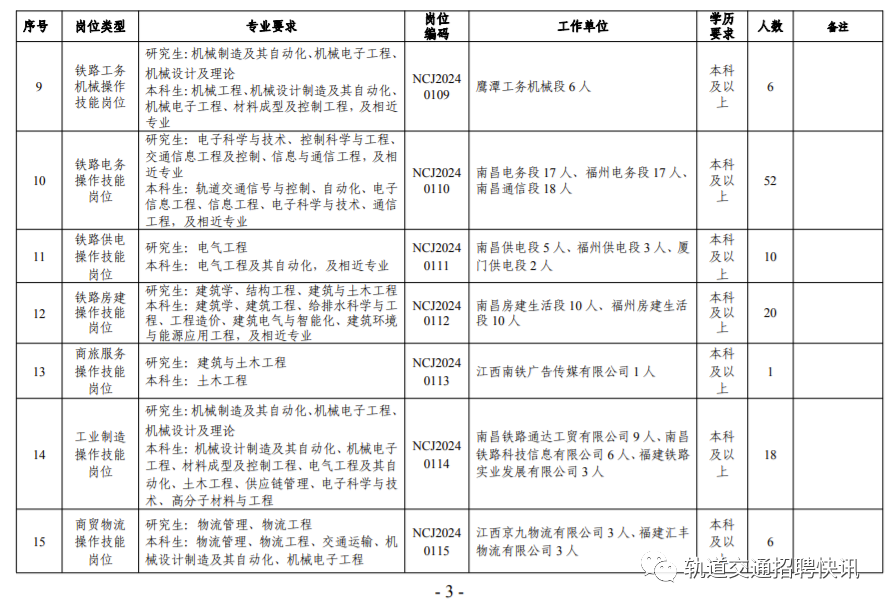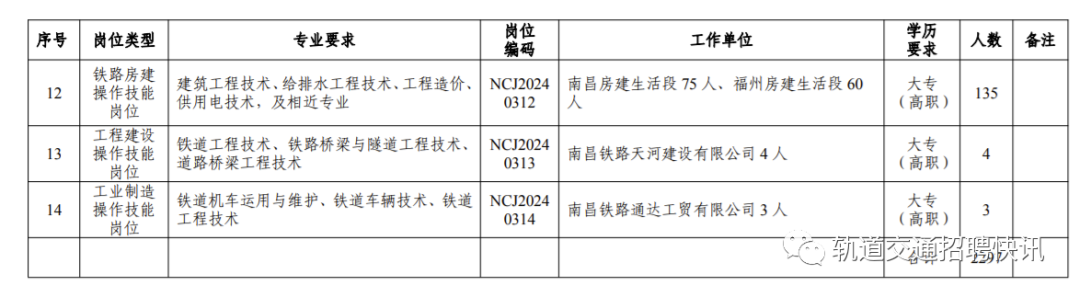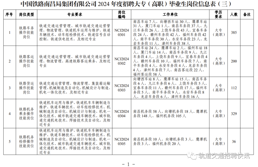 三、招聘流程 1.网上报名。报名采取网上报名方式,报名时间为2023年11月16 日至2024年3月31日。有意应聘的毕业生在规定时间内 进行报名,申请岗位时选择“中国铁路南昌局集团有限公司2024年度招聘本科及以上学历毕业生公告(二)”所对应的岗位,每人限报1个岗位。毕业生本人如实填写所有报名信息,真实、准确、完整上传毕业生就业推荐表、成绩单、学籍在线验证报告等电子附件,生成打印《毕业生应聘登记表》。 2.资格审查。根据招聘岗位要求,对应聘材料进行审核,择优筛选符合岗位要求的毕业生参加后续考试考核。未进入考试考核环节的毕业生不另行通知。 3.考试考核。序号为1-2的岗位以面试考核方式为主,序号为3-8的岗位通过“笔试+面试”的方式招录,其中序号为3的岗位增加试讲环节。接到通知的毕业生按指定时间、地点参加,否则视为放弃应聘。根据考试考核结果择优确定拟录用人选。 4.公示录用。拟录用人选通过中国铁路人才招聘网进行不少于7天的公示。公示期满无异议的,办理录用手续。 四、其他事项 1.本次招聘仅接受应聘人员本人在报名期间通过中国铁路人才招聘网报名,无其他报名方式,不接受邮寄、他人代交简历或电子邮箱发送简历。 2.应聘毕业生在招聘期间须保持通信畅通,凡未在规定时间内回复我公司通知、未按规定时间、地点和要求参加各招聘环节的,视为本人自动放弃。 3.所有信息须由毕业生本人如实填报,如发现网上填报及上传信息与实际信息不一致或弄虚作假的,取消应聘资格。 4.中国铁路南昌局集团有限公司不委托第三方招聘,不向应聘者收取任何费用,不指定辅导用书,不举办也不委托任何机构举办任何形式辅导培训班,请提高警惕,谨防受骗。 5.参加现场资格审核、面试考核时应聘人员须携带以下材料原件及复印件,材料用抽杆夹按顺序装订。 ⑴经本人签字确认的《毕业生应聘登记表》(报名网站下载打印); ⑵身份证,毕业生就业推荐表(加盖学校就业部门公章)、成绩单(加盖学校教务部门公章),教育部学籍在线验证报告(学信网按提示下载); ⑶体检报告。六个月内二级甲等及以上医院常规项目体检(血压、辨色力、视力、听力、心电图、胸片、血常规、尿常规、肝功能、肾功能为必检项目,须有体检结论); ⑷各种能够证明本人资历或能力的证书材料等。 6.中国铁路南昌局集团有限公司人事部保留对本招聘公告的最终解释权。 7.咨询电话:0791-87021951;咨询时间:工作日上午8:30-11:30,下午14:30-17:30。 中国铁路南昌局集团有限公司人事部 2023年11月16 日 2297人!中国铁路南昌局集团有限公司 2024年度招聘大专(高职)毕业生公告(三) 中国铁路南昌局集团有限公司根据企业发展需要,拟招聘普通高等院校大专(高职)毕业生,现将有关事项公告如下: 一、招聘计划 本次计划招聘2297人,招聘专业、岗位、人数和工作单位等内容详见附件。 二、招聘条件 1.列入国家招生计划的全日制普通高等院校应届大专(高职)毕业生; 2.遵纪守法,品行端正,热爱铁路事业; 3.所学专业为铁路专业方向,所学课程包含铁路专业课程;学习成绩优良,专业、学历等符合招聘岗位要求; 4.身心健康,身体条件符合招聘岗位要求,无色盲色弱; 5.素质能力符合招聘岗位工作要求,服从企业对岗位的安排和调整,能够适应偏远地区、长期夜班、轮班制工作环境; 6.工作所在地生源优先。