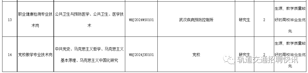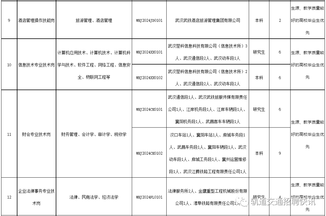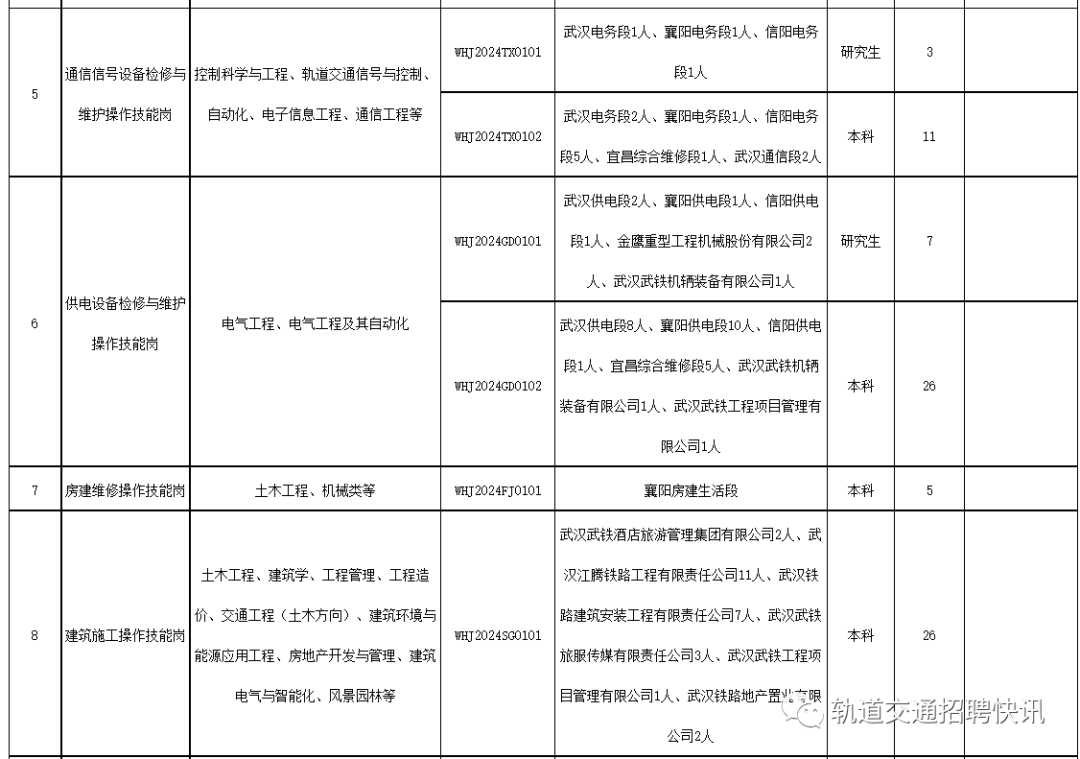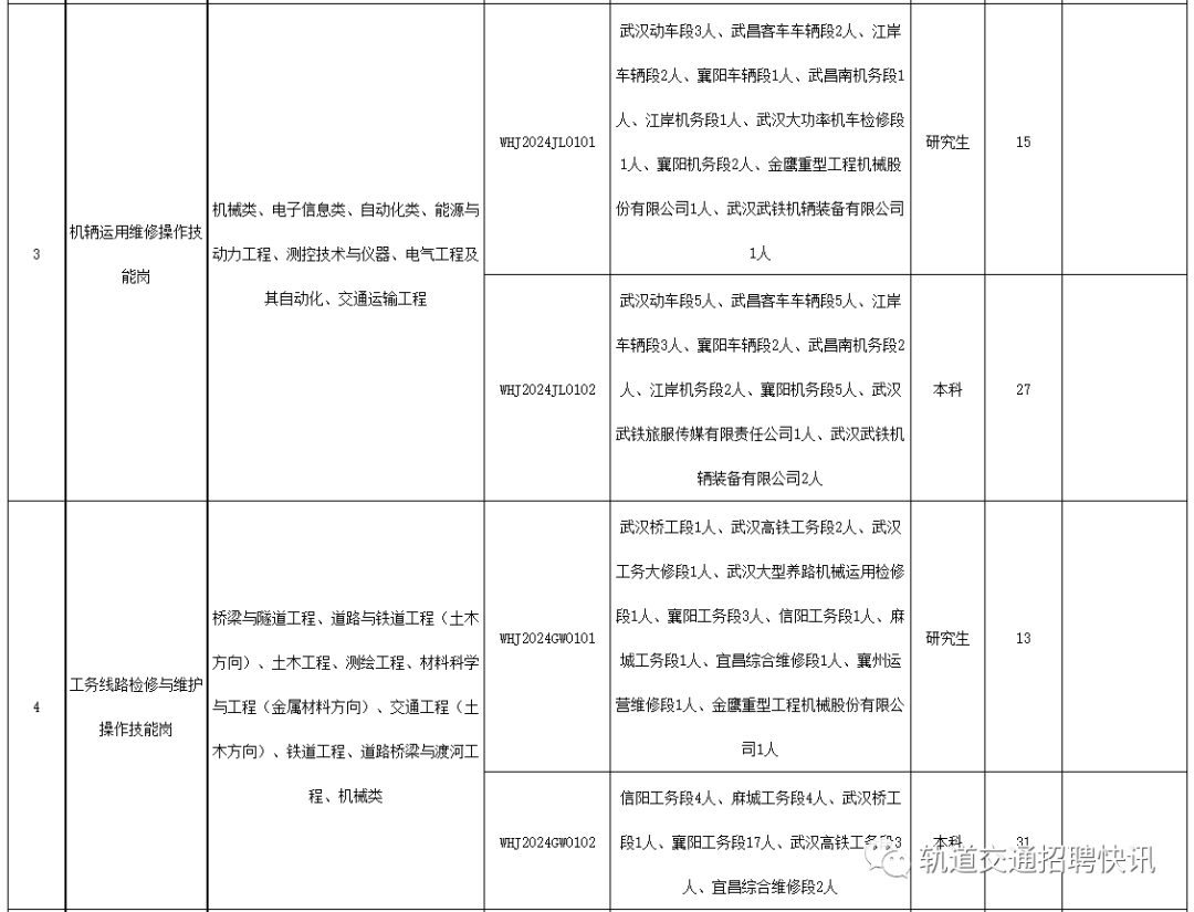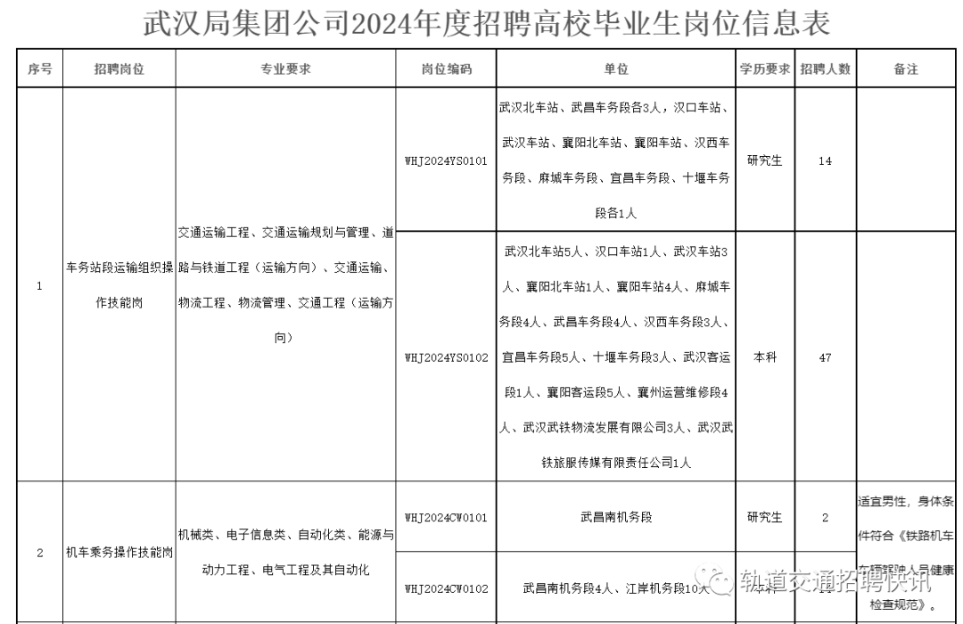 三、招聘流程 招聘流程包括:网上报名、资格审核、面试考核、确定拟录人员、公示录用等,具体如下: 1.网上报名。报名时间为2023年11月13日-2024年1月31日。有意应聘人员应在规定时间内 进行网上报名,每名应聘人员限报1个岗位,且学历、专业须符合岗位要求。 报名流程:注册用户-登录系统-填写基本信息-上传电子附件-选择应聘岗位-打印毕业生应聘登记表。 网上报名时,必须上传个人照片、身份证、就业推荐表、成绩单、教育部学籍在线验证报告等原件的扫描件,图像应清晰可辨认、信息要完整准确。应聘材料提交不全的,视为自动放弃。 2.资格审核。根据招聘岗位要求和专业对口原则,对应聘人员提交的应聘材料进行网上审核,若报名岗位与所学专业不对口或学历不符,即为审核不合格,不得进入下一环节。 3.面试考核。请接到通知的毕业生准备好以下材料原件:报名网页下载的毕业生应聘登记表,学校教务部门盖章的推荐表、成绩单、就业协议,近六个月二级甲等及以上医院健康体检报告,教育部学籍在线验证报告和其它能够证明本人资历或能力的材料,按指定的时间、地点参加考核,否则将被视为自行放弃应聘。 4.确定拟录人员。根据面试考核情况,择优确定拟录用人员名单。 5.公示录用。确定的拟录人员在中国铁路人才招聘网进行为期7天的公示,公示期满无问题的人员按要求办理录用手续。 四、其他事项 1.本次招聘仅接受学历、专业等符合要求的应聘者在报名期间通过中国铁路人才招聘网报名,不符者请勿报名,不接受上门、电话、传真、邮件等其他方式报名。 2.招聘过程中,未报名本公告人员不进入后续环节。应聘人员必须对本人所填报的报名信息和提供资料的真实性、准确性、完整性负责。资格审查贯穿招聘全程,凡不符合招聘条件或弄虚作假者,一经查实即取消应聘、录用资格。 3.网上报名成功后,应聘人员在招聘期间须保持通信畅通,并及时关注我公司消息、短信、邮件或电话,因通信不畅造成的后果由应聘人员个人承担,招聘单位不承担责任。凡未在规定时间内回复我公司通知、未按规定时间、地点和要求参加各招聘环节的,视为本人自动放弃。 4.医院出具的体检报告必检项目为:身高、血压、辨色力、视力、听力、心电图、胸片、血常规、尿常规、肝功能、肾功能,报告必须有检查结论。 5.本公司不委托第三方招聘,不向应聘者收取任何费用,不指定辅导用书,不举办也不委托任何机构或个人举办任何形式的咨询及辅导,请应聘人员提高警惕,谨防上当受骗。 6.本公司招聘公告仅通过“中国铁路人才招聘网”(http://rczp.china-railway.com.cn)发布,其他任何网站发布的招聘公告与中国铁路兰州局集团有限公司无关。 7.中国铁路兰州局集团有限公司人事部保留对招聘公告的最终解释权。 咨询电话:0931-4921791; 咨询时间:工作日8:30-11:30,14:30-17:30。 附件:中国铁路兰州局集团有限公司2024年招聘普通高校毕业生公告(二)岗位信息表.pdf 中国铁路兰州局集团有限公司人事部 2023年11月13日 278人!中国铁路武汉局集团有限公司 2024年招聘高校毕业生公告(一) 中国铁路武汉局集团有限公司根据经营发展需求,拟招聘普通高等院校本科及以上学历毕业生,现将有关事项公告如下: 一、招聘计划 本次招聘分为专业技术和操作技能两类岗位,具体岗位、专业、人数等信息见附表。 二、招聘条件 1.2024、2023年毕业,列入国家招生计划,现未与任何单位签订就业协议的研究生和全日制普通高等院校本科学历毕业生; 2.遵纪守法,品行端正,热爱铁路事业,认同企业文化; 3.身心健康,具备正常履行岗位职责的身体条件,其中操作技能岗要求无色盲色弱,机车乘务岗要求身体条件符合《铁路机车车辆驾驶人员健康检查规范》规定的标准; 4.学习成绩优良,专业、学历等符合招聘岗位要求。铁路专业方向(包含铁路专业课程)的高校毕业生、生源及教学质量较好的高校毕业生优先; 5.素质能力适应招聘岗位工作要求,服从企业对岗位安排和调整,能够适应偏远地区工作及夜班、流动作业环境。