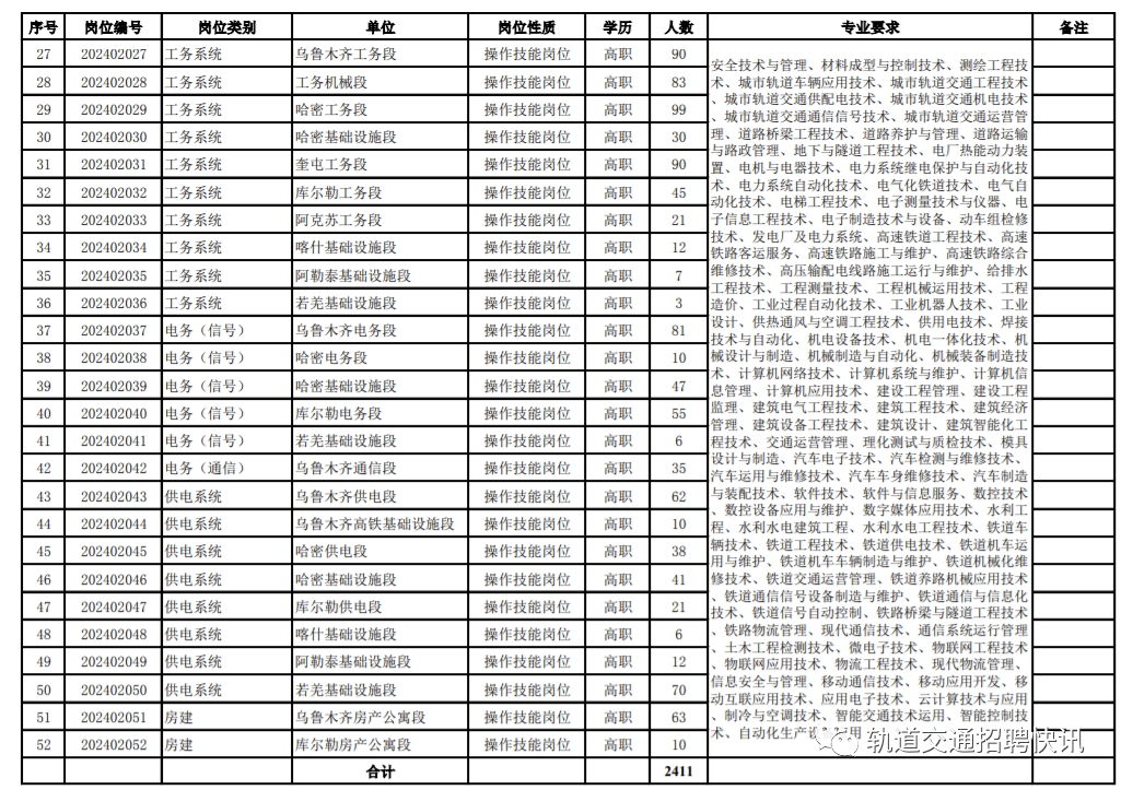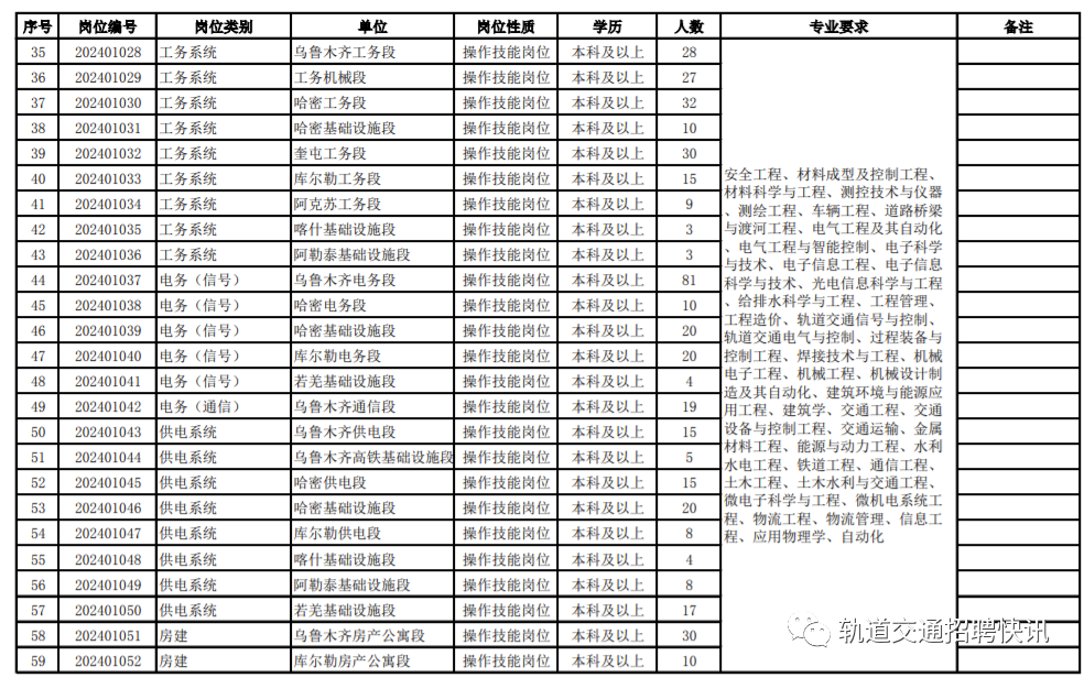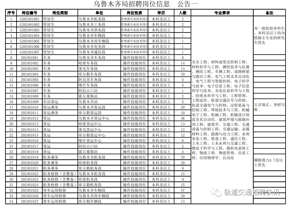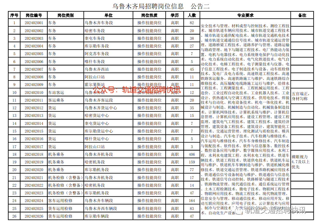 三、招聘流程 本次招聘采取校园招聘方式,招聘流程按网上报名、资格审查、面试考核、公示录用等环节进行,具体如下: 1.网上报名。报名采取网上报名方式,报名时间为2023年11月16日—2023年12月31日。应聘者请先在 查看“咨询问答”,完成实名注册后在规定的时间内登录网站,按照岗位 要求与专业要求相一致的原则选择岗位进行网上报名,每人只能投递一次简历且限报1个岗位,投递前请仔细核对检查, 简历一经投递不能撤回和更换。报名时毕业生须上传《教育部学籍在线验证报告》,应聘者本人须如实填写所有报名信 息,生成打印《毕业生应聘登记表》。 2.资格审查。根据招聘岗位要求,对应聘材料进行网上审核,择优筛选符合岗位要求的应聘者参加校园面试考核, 面试考核前要进行资格复审。对入围面试考核人员由学校就业部门进行通知,优质院校毕业生电话通知。未入围人员不再 另行通知。 3.面试考核。面试考核具体时间地点以学校通知为准。面试结束后,根据毕业生面试情况综合考量评价,确定拟录 用人员和拟聘用岗位。 4.公示录用。拟录用人选通过中国铁路人才招聘网进行7天的公示。公示无异议正式签订就业协议。 四、其它事项 1.本次招聘仅接受应聘者本人在报名期间通过中国铁路人才招聘网进行网上报名。 2.应聘者应保持手机畅通,及时关注学校通知,及时用报名时的用户名登录中国铁路人才招聘网站查看“我的消息”, 按照指定时间、地点及有关要求参加应聘。未按规定时间、地点和要求参加各招聘环节的,视为本人自动放弃。 3.所有信息须由应聘者本人如实填报,如发现网上填报及上传信息与实际信息不一致或弄虚作假的,取消应聘资 格。 4.本次招聘不向应聘者收取任何费用,不指定辅导用书,不举办也不委托任何机构或个人举办任何形式的辅导培训 班,请提高警惕,谨防受骗。 5.参加面试考核时应聘者须携带以下材料及复印件,复印件不予退回: (1)经本人签字确认的《毕业生应聘登记表》(报名网站下载,A4纸正反面打印); (2)身份证原件,各种能够证明本人资历或能力的证书材料等; (3)就业推荐表原件(加盖学校就业部门公章)、成绩单原件(加盖学校教务部门公章),学信网下载打印的《教 育部学籍在线验证报告》(验证期应至2024年3月31日,专升本、硕士研究生还应准备前一学历证件并上传); (4)全国普通高等学校毕业生就业协议书; (5)体检报告。六个月内二级甲等及以上医院体检并有检查结论。体检项目中血压、辨色力、视力(裸眼及矫 正)、听力、心电图、胸片、血常规、尿常规、肝功能、肾功能为必检项目。 6.招聘的管培生在专业对口岗位培养3年,期满考核合格,定职到管理岗位或专业技术岗位工作。 7.中国铁路乌鲁木齐局集团有限公司人事部保留对本公告的最终解释权。 8.报名咨询电话0991-7923379; 报名咨询时间:2023年11月16日—12月30日,工作日10:00-12:00。 中国铁路乌鲁木齐局集团有限公司人事部 2023年11月16日 2411人!中国铁路乌鲁木齐局集团有限公司 2024年招聘普通高校毕业生公告二 中国铁路乌鲁木齐局集团有限公司根据企业发展需要,拟招聘全日制普通高等院校高职(大专)毕业生,现将有关事 项公告如下: 一、招聘计划 招聘岗位、人数和专业要求等内容详见附件。 二、应聘条件 1.2024年应届毕业,列入国家招生计划的全日制普通高等院校高职(大专)生。2023届离校未就业毕业生以应届毕 业生身份参加应聘。 2.遵纪守法,品行端正,身心健康,身体条件符合招聘岗位要求。 3.热爱铁路事业,认同铁路企业文化,具有良好的敬业精神和团队合作精神。 4.符合具体岗位要求的学历、专业等条件,所学专业为铁路方向或所学课程中包含铁路专业课程的毕业生优先。 5.素质能力适应招聘岗位工作要求,服从企业对岗位及工作地点的安排和调整,能够适应铁路沿线工作环境和轮班 制工作。
