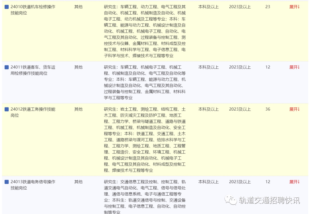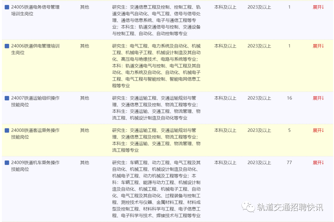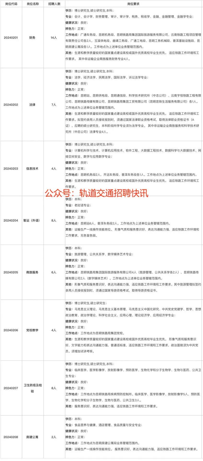 三、招聘程序 1.网络报名。应聘学生自公告发布之日起至2023年11月23日止,登录中国铁路昆明局集团有限公司人才招聘平台(https://rczp.kunming-railway.cn)进行注册和网上报名,认真填写相关信息并打印《毕业生应聘登记表》,按照专业与岗位匹配的原则,每名学生限报1个岗位,截止时间过后不再受理任何形式的报名。 2.资格审查及面试考核。 (1)根据应聘学生网上填报的专业方向、岗位匹配、综合能力等方面的情况进行资格审核和筛选,择优确定拟面试人选,分期分批对应聘学生进行面试,具体面试安排及结果由相关院校或通过中国铁路昆明局集团有限公司人才招聘平台推送消息通知应聘学生,未进入面试考核环节的恕不另行通知。请报名应聘学生适时关注并按通知要求参加面试考核,过时责任自负。 (2)参加面试的学生须提供以下材料的原件进行审查,同时收取复印件(所收取的材料概不退还,凡资料不全者不予面试),按下列顺序装订成册:①通过网络打印的《毕业生应聘登记表》;②在教育部学信网下载打印的《教育部学籍在线验证报告》(文件下载保存为PDF格式);③全国普通高等学校毕业生就业协议书;④毕业生就业推荐表、成绩单(须学校盖章);⑤第二代身份证复印件;⑥其他能够证明本人资历或能力的材料;⑦近6个月内二级甲等及以上医院体检报告,身高、体重、血压、辨色力、裸眼视力、听力、心电图、外科、胸片、血常规、尿常规、肝功能、肾功能(含尿酸)等为必检项目。上述体检报告等材料,须提前准备,以免影响正常应聘。面试考核时同步进行资格复审。 3.确定拟录用人选。通过面试考核综合比选,择优确定拟录用人员,签订就业协议书及补充协议。 4.公示及办理入职手续。拟录用人员通过中国铁路昆明局集团有限公司人才招聘平台进行公示,期满不影响录用的,办理入职相关手续。 四、其它事项 1.本次招聘仅接受应聘学生网络报名,无其他报名方式。 2.应聘学生应保证有关报名信息和所提交应聘材料的真实性,一经发现弄虚作假,取消应聘或录用资格。资格审查贯穿招聘全过程,一旦发现资格条件不符合即终止后续程序。 3.本次招聘不收取任何费用,不指定辅导用书,不举办辅导培训班,也不委托其他机构承办,请应聘学生提高警惕,谨防受骗。 4.应聘学生须在招聘期间保持本人手机畅通,凡因应聘学生通信不畅造成的后果,本公司不承担任何责任;凡未在规定时间内回复我公司通知,未按规定时间、地点和要求参加各招聘环节的,视为本人自动放弃。 5.中国铁路昆明局集团有限公司保留对招聘公告及相关规定的最终解释权。 6.咨询电话:0871-66122731。 咨询时间:工作日上午8:30-11:30、下午14:30-17:00。 非咨询时间、非咨询电话概不受理,敬请谅解。 附件:1. 中国铁路昆明局集团有限公司2024年度招聘普通 高校高职大专学历毕业生计划表 2. 中国铁路昆明局集团有限公司2024年度招聘普通高校本科及以上学历毕业生计划表 中国铁路昆明局集团有限公司人事部 2023年11月8日 53人!中国铁路昆明局集团有限公司2024年度 招聘普通高校毕业生公告(二) 中国铁路昆明局集团有限公司根据企业发展需要,现将2024年度招聘普通高校毕业生具体事宜公告如下: 一、招聘计划 本次招聘社会通用专业本科及以上毕业生8个岗位(岗位代码为20240201-20240208),各招聘岗位的人数、学历、专业、工作单位及地点等要求详见招聘计划表(附件)。 二、招聘条件 1.列入国家招生计划的应届研究生、全日制普通高等院校本科学历应届毕业生(含通过国家教育部学历认证的本科及以上学历的应届留学生、港澳生)。 2.遵纪守法,品行端正,热爱铁路事业。 3.学习成绩优良,专业、学历等符合招聘岗位要求。 4.身心健康,身体条件符合招聘岗位要求。 5.服从中国铁路昆明局集团有限公司及所属用人单位对岗位、工作地点的安排和调整,能够适应铁路单位工作环境和岗位工作要求。