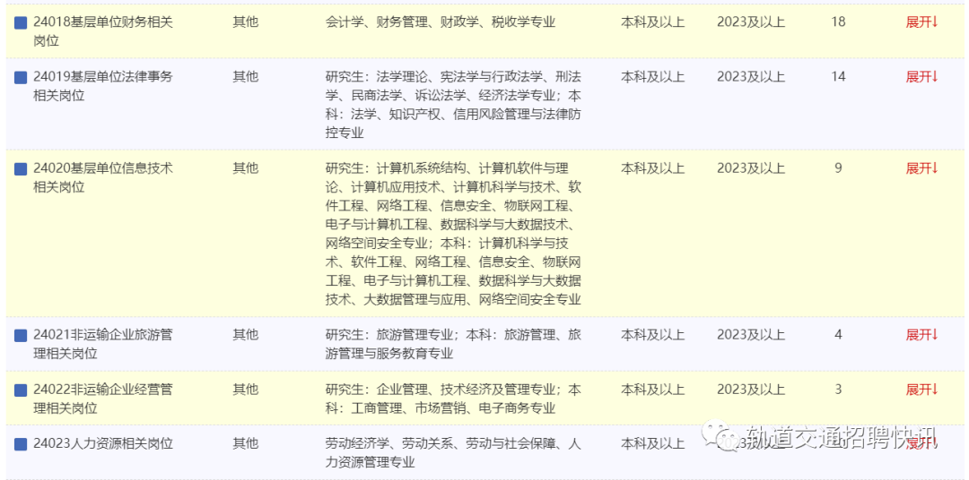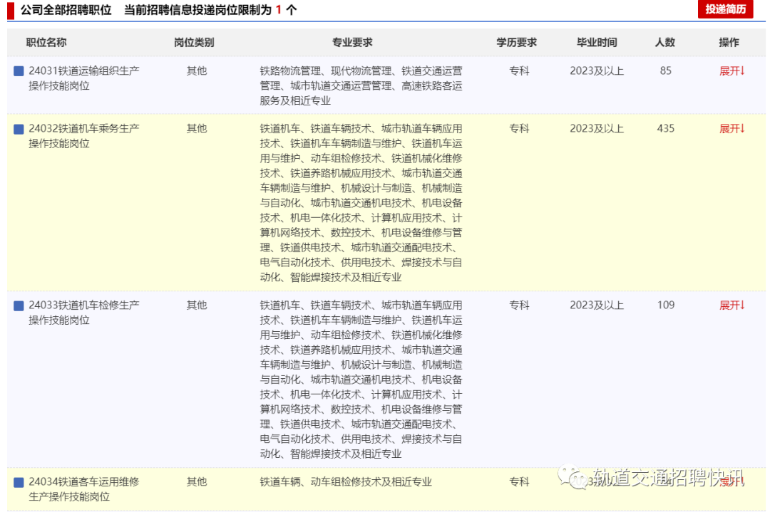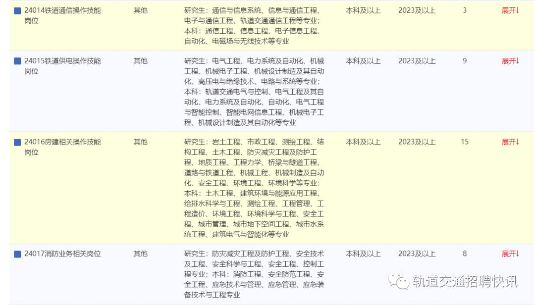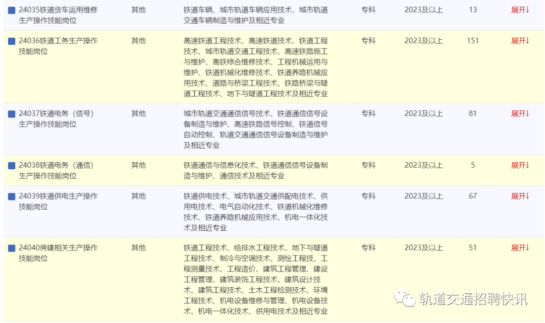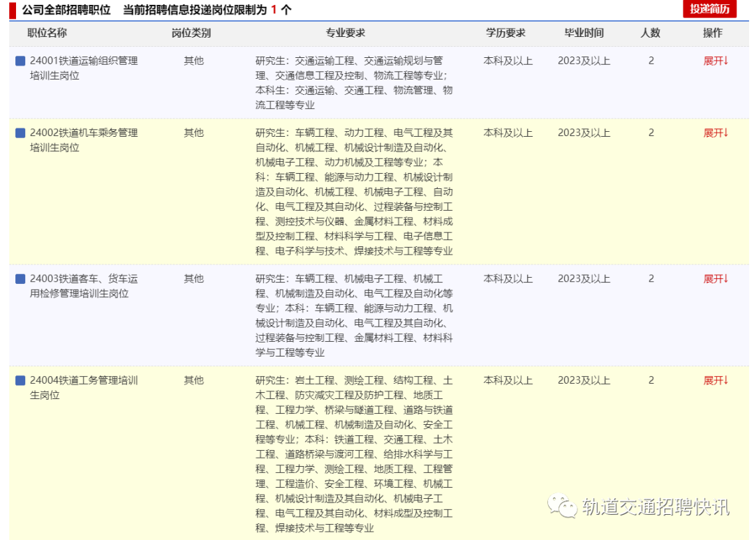 三、招聘程序 1.网络报名。应聘学生自公告发布之日起至2023年11月23日止,登录中国铁路昆明局集团有限公司人才招聘平台(https://rczp.kunming-railway.cn)进行注册和网上报名,认真填写相关信息并打印《毕业生应聘登记表》,按照专业与岗位匹配的原则,每名学生限报1个岗位,截止时间过后不再受理任何形式的报名。 2.资格审查及面试考核。 (1)根据应聘学生网上填报的专业方向、岗位匹配、综合能力等方面的情况进行资格审核和筛选,择优确定拟面试人选,分期分批对应聘学生进行面试,具体面试安排及结果由相关院校或通过中国铁路昆明局集团有限公司人才招聘平台推送消息通知应聘学生,未进入面试考核环节的恕不另行通知。请报名应聘学生适时关注并按通知要求参加面试考核,过时责任自负。 (2)参加面试的学生须提供以下材料的原件进行审查,同时收取复印件(所收取的材料概不退还,凡资料不全者不予面试),按下列顺序装订成册:①通过网络打印的《毕业生应聘登记表》;②在教育部学信网下载打印的《教育部学籍在线验证报告》(文件下载保存为PDF格式);③全国普通高等学校毕业生就业协议书;④毕业生就业推荐表、成绩单(须学校盖章);⑤第二代身份证复印件;⑥其他能够证明本人资历或能力的材料;⑦近6个月内二级甲等及以上医院体检报告,身高、体重、血压、辨色力、裸眼视力、听力、心电图、外科、胸片、血常规、尿常规、肝功能、肾功能(含尿酸)等为必检项目。上述体检报告等材料,须提前准备,以免影响正常应聘。面试考核时同步进行资格复审。 3.确定拟录用人选。通过面试考核综合比选,择优确定拟录用人员,签订就业协议书及补充协议。 4.公示及办理入职手续。拟录用人员通过中国铁路昆明局集团有限公司人才招聘平台进行公示,期满不影响录用的,办理入职相关手续。 四、其它事项 1.本次招聘仅接受应聘学生网络报名,无其他报名方式。 2.应聘学生应保证有关报名信息和所提交应聘材料的真实性,一经发现弄虚作假,取消应聘或录用资格。资格审查贯穿招聘全过程,一旦发现资格条件不符合即终止后续程序。 3.本次招聘不收取任何费用,不指定辅导用书,不举办辅导培训班,也不委托其他机构承办,请应聘学生提高警惕,谨防受骗。 4.应聘学生须在招聘期间保持本人手机畅通,凡因应聘学生通信不畅造成的后果,本公司不承担任何责任;凡未在规定时间内回复我公司通知,未按规定时间、地点和要求参加各招聘环节的,视为本人自动放弃。 5.中国铁路昆明局集团有限公司保留对招聘公告及相关规定的最终解释权。 6.咨询电话:0871-66122731。 咨询时间:工作日上午8:30-11:30、下午14:30-17:00。 非咨询时间、非咨询电话概不受理,敬请谅解。 附件:1. 中国铁路昆明局集团有限公司2024年度招聘普通 高校高职大专学历毕业生计划表 2. 中国铁路昆明局集团有限公司2024年度招聘普通高校本科及以上学历毕业生计划表 中国铁路昆明局集团有限公司人事部 2023年11月8日 53人!中国铁路昆明局集团有限公司2024年度 招聘普通高校毕业生公告(二) 中国铁路昆明局集团有限公司根据企业发展需要,现将2024年度招聘普通高校毕业生具体事宜公告如下: 一、招聘计划 本次招聘社会通用专业本科及以上毕业生8个岗位(岗位代码为20240201-20240208),各招聘岗位的人数、学历、专业、工作单位及地点等要求详见招聘计划表(附件)。 二、招聘条件 1.列入国家招生计划的应届研究生、全日制普通高等院校本科学历应届毕业生(含通过国家教育部学历认证的本科及以上学历的应届留学生、港澳生)。 2.遵纪守法,品行端正,热爱铁路事业。 3.学习成绩优良,专业、学历等符合招聘岗位要求。 4.身心健康,身体条件符合招聘岗位要求。 5.服从中国铁路昆明局集团有限公司及所属用人单位对岗位、工作地点的安排和调整,能够适应铁路单位工作环境和岗位工作要求。