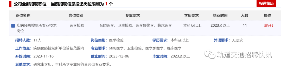 三、招聘流程 本次招聘采取校园招聘方式,招聘流程按网上报名、资格审查、面试考核、公示录用等环节进行,具体如下: 1.网上报名。报名采取网上报名方式,报名时间为2023年11月16日—2023年12月31日。应聘者须在 实名注册后在规定的时间内登录网站,按照岗位要求与专业要求相一致的原 则选择岗位进行网上报名,每人只能投递一次简历且限报1个岗位,投递前请仔细核对检查,简历一经投递不能撤回和更 换。报名时毕业生须上传《教育部学籍在线验证报告》,应聘者本人须如实填写所有报名信息,生成打印《毕业生应聘登 记表》。 2.资格审查。根据招聘岗位要求,对应聘材料进行网上审核,择优筛选符合岗位要求的应聘者参加校园面试考核, 面试考核前要进行资格复审。对入围面试考核人员通过学校就业部门进行通知。未入围人员不再另行通知。 3.面试考核。面试考核具体时间地点以学校通知为准。面试结束后,根据毕业生面试情况综合考量评价,确定拟录 用人员和拟聘用岗位。 4.公示录用。拟录用人选通过中国铁路人才招聘网进行7天的公示。公示无异议正式签订就业协议。 四、其它事项 1.本次招聘仅接受应聘者本人在报名期间通过中国铁路人才招聘网进行网上报名。 2.应聘者应保持手机畅通,及时关注学校通知,及时用报名时的用户名登录中国铁路人才招聘网站查看“我的消息”, 按照指定时间、地点及有关要求参加应聘。未按规定时间、地点和要求参加各招聘环节的,视为本人自动放弃。 3.所有信息须由应聘者本人如实填报,如发现网上填报及上传信息与实际信息不一致或弄虚作假的,取消应聘资格。 4.本次招聘不向应聘者收取任何费用,不指定辅导用书,不举办也不委托任何机构或个人举办任何形式的辅导培训 班,请提高警惕,谨防受骗。 5.参加面试考核时应聘者须携带以下材料及复印件,复印件不予退回: (1)经本人签字确认的《毕业生应聘登记表》(报名网站下载,A4纸正反面打印); (2)身份证原件,各种能够证明本人资历或能力的证书材料等; (3)就业推荐表原件(加盖学校就业部门公章)、成绩单原件(加盖学校教务部门公章),学信网下载打印的《教 育部学籍在线验证报告》(验证期应至2024年3月31日); (4)全国普通高等学校毕业生就业协议书; (5)体检报告。六个月内二级甲等及以上医院常规项目体检表,体检项目中血压、辨色力、视力(裸眼及矫正)、 听力、心电图、胸片、血常规、尿常规、肝功能、肾功能为必检项目。 6.中国铁路乌鲁木齐局集团有限公司人事部保留对本公告的最终解释权。 7.报名咨询电话0991-7923379; 报名咨询时间:2023年11月16日—12月30日,工作日10:00-12:00。 中国铁路乌鲁木齐局集团有限公司人事部 2023年11月16日 11人!中国铁路乌鲁木齐局集团有限公司 2024年招聘普通高校毕业生公告三 中国铁路乌鲁木齐局集团有限公司根据企业发展需要,拟招聘普通高等院校本科及以上学历毕业生,现将有关事项公 告如下: 一、招聘岗位、专业、人数 疾病预防控制所专业技术岗位,医学影像、临床医疗专业11人。 二、招聘条件 1.2024年应届毕业,列入国家招生计划的普通高等院校研究生、全日制本科毕业生。2023届离校未就业毕业生以应 届毕业生身份参加应聘。 2.遵纪守法,品行端正,身心健康,身体条件符合招聘岗位要求。 3.认同铁路企业文化,具有高度的责任心、良好的职业道德和严谨的工作作风,良好的团队协作精神及服务意识。 4.符合招聘岗位要求的学历、专业等条件。 5.服从单位对岗位及工作地点的安排和调整。 6.取得大型仪器上岗证和执业医师资格证者优先。
