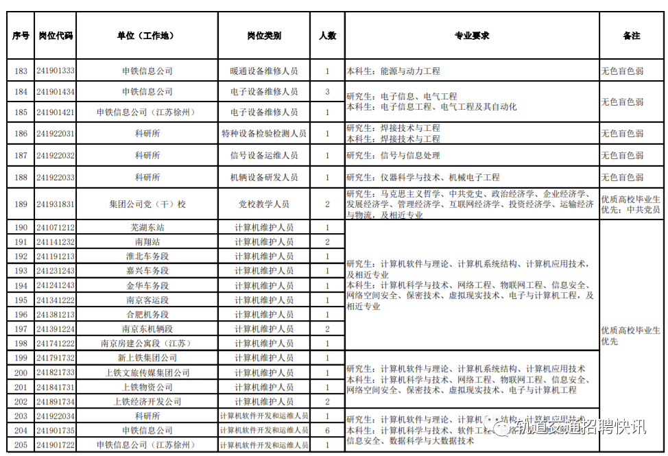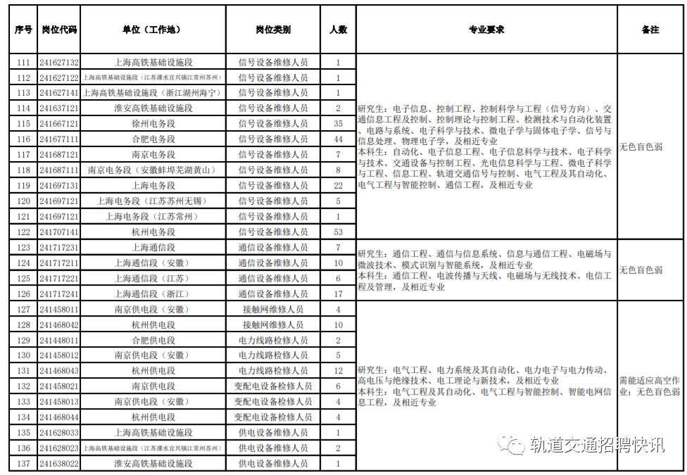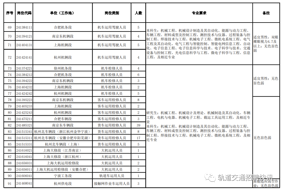 1、1005人!中国铁路上海局集团有限公司招聘2024年毕业生公告一(本科及以上学历) 2、2757人!中国铁路上海局集团有限公司招聘2024年毕业生公告二(高等职业院校) 3、1316人!中国铁路昆明局集团有限公司2024年度招聘普通高校毕业生公告(一) 4、53人!中国铁路昆明局集团有限公司2024年度招聘普通高校毕业生公告(二) 5、665人!中国铁路兰州局集团有限公司2024年招聘普通高校毕业生公告一(本科及以上学历) 6、2280人!中国铁路兰州局集团有限公司2024年招聘普通高校毕业生公告二(高等职业院校) 7、278人!中国铁路武汉局集团有限公司2024年招聘高校毕业生公告(一) 8、910人!中国铁路乌鲁木齐局集团有限公司2024年招聘普通高校毕业生公告一 9、2411人!中国铁路乌鲁木齐局集团有限公司2024年招聘普通高校毕业生公告二 10、11人!中国铁路乌鲁木齐局集团有限公司2024年招聘普通高校毕业生公告三 11、538人!中国铁路南昌局集团有限公司2024年度招聘本科及以上学历毕业生公告(一) 12、44人!中国铁路南昌局集团有限公司2024年度招聘本科及以上学历毕业生公告(二) 13、2297人!中国铁路南昌局集团有限公司2024年度招聘大专(高职)毕业生公告(三) 14、284人!中国铁路青藏集团有限公司2024年招聘普通高校本科及以上学历毕业生公告(一) 15、1061人!中国铁路青藏集团有限公司2024年招聘全日制普通高校大专(高职)毕业生公告(二) 1005人!中国铁路上海局集团有限公司 招聘2024年毕业生公告一(本科及以上学历) 中国铁路上海局集团有限公司根据企业发展需要,拟招聘统招统分应届本科及以上学历普通高等学校毕业生,现将具体事项公告如下: 一、招聘岗位代码、单位、岗位类别、人数及专业要求(见附件) 二、招聘条件 1.2024年毕业,列入国家招生计划的应届本科及以上学历普通高等学校毕业生,或2024年经国家教育部学历认证的本科及以上学历的归国留学生。2023届离校未就业毕业生以应届毕业生身份参加应聘。 2.遵纪守法,品行端正,热爱铁路事业;素质能力适应招聘岗位工作要求,能够适应铁路沿线偏远地区、野外作业及长期夜班工作。 3.具有良好的心理素质,部分岗位要求无色盲色弱,身心健康,符合招聘岗位职业健康规范标准。 4.符合招聘岗位要求的学历、专业等条件,未与任何单位签订就业协议。 5.优质高校毕业生和工作单位所在地生源优先。