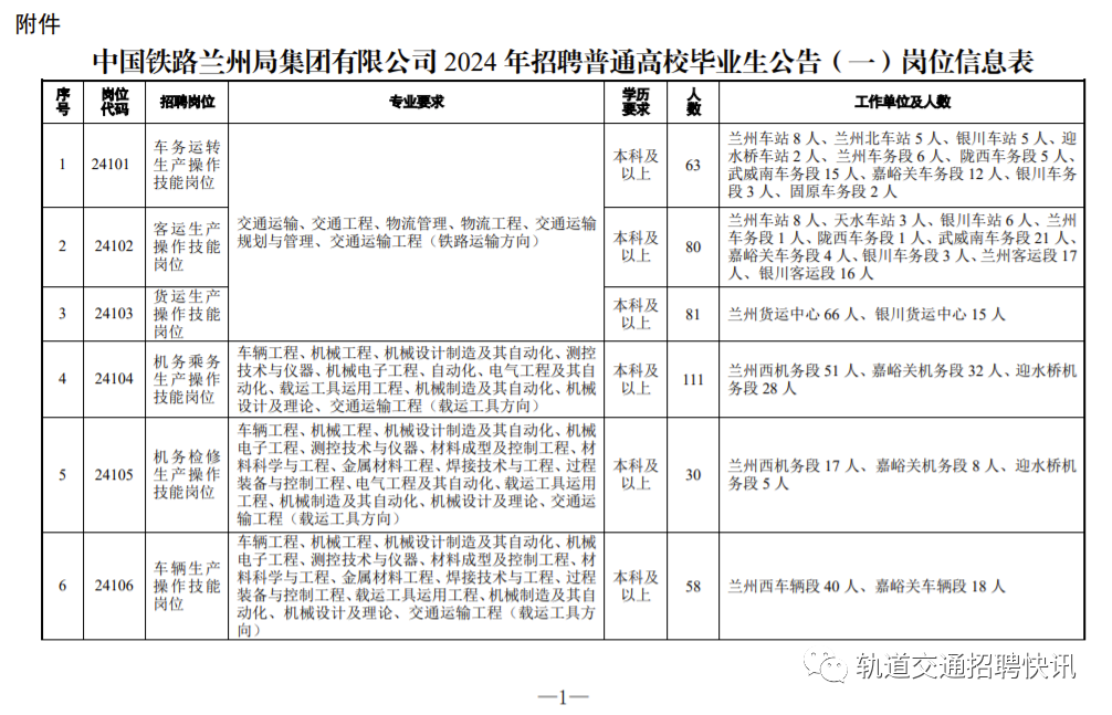 三、招聘程序 1.网络报名。应聘学生自公告发布之日起至2023年11月23日止,登录中国铁路昆明局集团有限公司人才招聘平台(https://rczp.kunming-railway.cn)进行注册和网上报名,认真填写相关信息并打印《毕业生应聘登记表》,按照专业与岗位匹配的原则,每名学生限报1个岗位,截止时间过后不再受理任何形式的报名。 2.考试考核。 (1)笔试考核。根据应聘学生网上填报的专业方向、岗位匹配、综合能力等方面的情况进行资格审核和筛选后,委托第三方机构命题,组织开展笔试。未进入笔试环节的恕不另行通知。 (2)面试考核。根据笔试成绩从高到低顺序,按照1:3比例确定面试人选,未达到此比例的全部纳入面试。党校教学岗位(代码20240206)须增加试讲考核。 参加面试的学生须提供以下材料的原件进行审查,同时收取复印件(所收取的材料概不退还,凡资料不全者不予面试),按下列顺序装订成册:①通过网络打印的《毕业生应聘登记表》;②在教育部学信网下载打印的《教育部学籍在线验证报告》(文件下载保存为PDF格式);③全国普通高等学校毕业生就业协议书;④毕业生就业推荐表、成绩单(须学校盖章);⑤第二代身份证复印件;⑥其他能够证明本人资历或能力的材料;⑦近6个月内二级甲等及以上医院体检报告,身高、体重、血压、辨色力、裸眼视力、听力、心电图、外科、胸片、血常规、尿常规、肝功能、肾功能(含尿酸)等为必检项目。上述体检报告等材料,须提前准备,以免影响正常应聘。面试考核时同步进行资格复审。 3.确定拟录用人选。按照笔试、面试各占50%(党校教学岗位按照笔试30%、面试30%、试讲40%)的比例折算成绩,择优确定拟录用人员,签订就业协议书及补充协议。 4.公示及办理入职手续。拟录用人员通过中国铁路昆明局集团有限公司人才招聘平台进行公示,期满不影响录用的,办理入职相关手续。 四、其它事项 1.本次招聘仅接受应聘学生网络报名,无其他报名方式。 2.应聘学生应保证有关报名信息和所提交应聘材料的真实性,一经发现弄虚作假,取消应聘或录用资格。资格审查贯穿招聘全过程,一旦发现资格条件不符合即终止后续程序。 3.本次招聘不收取任何费用,不指定辅导用书,不举办辅导培训班,也不委托其他机构承办,请应聘学生提高警惕,谨防受骗。 4.应聘学生须在招聘期间保持本人手机畅通,笔试、面试安排及结果等通过中国铁路昆明局集团有限公司人才招聘平台推送消息通知应聘学生。凡因应聘学生通信不畅造成的后果,本公司不承担任何责任;凡未在规定时间内回复我公司通知,未按规定时间、地点和要求参加各招聘环节的,视为本人自动放弃。 5.中国铁路昆明局集团有限公司保留对招聘公告及相关规定的最终解释权。 6.咨询电话:0871-66122731。 咨询时间:工作日上午8:30-11:30、下午14:30-17:00。 非咨询时间、非咨询电话概不受理,敬请谅解。 附件:中国铁路昆明局集团有限公司2024年度招聘普通 高校社会通用专业本科及以上学历毕业生计划表 中国铁路昆明局集团有限公司人事部 2023年11月8日 665人!中国铁路兰州局集团有限公司 2024年招聘普通高校毕业生公告一(本科及以上学历) 中国铁路兰州局集团有限公司因工作需要,招聘普通高等院校应届本科及以上学历毕业生,现将有关事项公告如下: 一、招聘岗位及专业要求 本次计划招聘665人,招聘岗位、专业、工作单位及招聘人数详见附件。 二、招聘条件 1.2024年毕业,列入国家招生计划的应届普通高等院校研究生、全日制本科学历毕业生。2023届已毕业离校未就业毕业生以应届毕业生身份参加应聘。 2.品行端正,遵纪守法,热爱铁路事业,认同铁路企业文化,具有良好的敬业精神和团队协作意识,能够适应偏远地区、长期夜班、轮班制工作环境。 3.学历、专业等符合招聘岗位要求,所学专业(以主修专业为准)为铁路专业方向,所学课程包含铁路相关课程。 4.身心健康,视力、听力和辨色力正常,无色盲色弱,具备正常履行岗位职责的身体条件,其中机务乘务岗位要求身体条件符合《铁路机车车辆驾驶人员健康检查规范》规定的标准。 5.工作单位所在地生源优先。