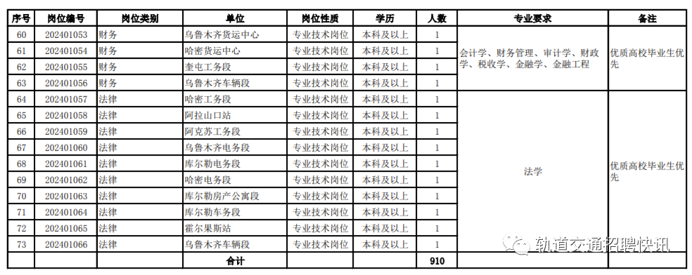 三、招聘流程 招聘流程按网上报名、网上资格审查与筛选、网上测评、资格复审、考试考核、公示录用等环节进行,具体如下: 1.网上报名。报名时间为2023年11月15日-12月31日。符合条件且有意应聘人员在规定时间内 按照招聘岗位的学历、专业要求选报,每人限报1个岗位。毕业生本人如实填写所有报名信息,并在“电子附件栏”对应上传相关材料,生成打印《毕业生应聘登记表》。 2.网上资格审查与筛选。根据招聘岗位、专业、学校办学质量、岗位适配度等要素,进行网上审查筛选,择优确定入围人选。 3.网上测评。通过资格审查与筛选的毕业生按通知要求参加网上测评。 4.资格复审。请应聘毕业生按通知要求并准备以下材料原件及复印件参加资格复审,否则视为放弃应聘,复审合格者进入下一个环节: ⑴本人签字确认的《毕业生应聘登记表》(网上报名时打印); ⑵教育部学籍在线验证报告(有效期内),2023年毕业生还需提供毕业证及电子注册备案表(有效期内); ⑶身份证原件和复印件; ⑷《就业推荐表》原件(须学校盖章)和复印件; ⑸《成绩单》原件(包含大学期间已学全部课程成绩并由学校教务部门加盖公章)和复印件; ⑹奖学金证书、获奖证书、荣誉称号证书等证明本人资历或能力的材料原件和复印件; ⑺《普通高等院校毕业生就业协议书》(须学校盖章); ⑻体检报告原件(六个月内,二级甲等及以上医院常规项目体检报告,其中血压、辨色力、视力、听力、心电图、胸片、血常规、尿常规、肝功能、肾功能为必检项目)。 5.考试考核。请应聘毕业生接到考试考核通知后按要求参加,否则视为自动放弃。根据考试考核成绩择优确定拟录用人选。 6.公示录用。拟录用人员在中国铁路人才招聘网公示。公示期满无异议的,办理签约录用手续。 四、其他事项 1.本次招聘仅接收应聘者本人通过中国铁路人才招聘网报名,不接受上门、电话、传真、邮件等其他方式报名。 2.资格审查贯穿招聘工作全过程。应聘人员应对本人填报信息、提供资料的真实性、准确性、完整性负责,凡不符合招聘条件或弄虚作假的,一经查实即取消应聘及录用资格。 3.应聘者须在招聘期间保持本人所留联系方式畅通,随时关注中国铁路人才招聘网个人账户站内消息及相关通知,对通知未及时回复或未按时参加网上测评、考试考核的,视为自动放弃。凡因应聘者通信不畅造成的后果,本公司不承担责任。招聘过程中,凡未进入下一环节者,不再单独通知,敬请谅解。 4.中国铁路武汉局集团有限公司招聘毕业生的官方网站为中国铁路人才招聘网。 5.本次招聘不向应聘人员收取任何费用,不指定辅导用书,不举办也不委托任何机构或个人举办任何形式的咨询及辅导,请提高警惕,谨防受骗。 6.中国铁路武汉局集团有限公司人事部保留对本招聘公告及附件中各项要求的最终解释权。 7.咨询电话:027-51122511 咨询时间:报名期间工作日9:00-11:00 15:00-17:00 附:武汉局集团公司2024年度招聘高校毕业生岗位信息表 中国铁路武汉局集团有限公司人事部 2023年11月15日 910人!中国铁路乌鲁木齐局集团有限公司 2024年招聘普通高校毕业生公告一 中国铁路乌鲁木齐局集团有限公司根据企业发展需要,拟招聘普通高等院校本科及以上学历毕业生,现将有关事项公 告如下: 一、招聘计划 招聘岗位、人数和专业要求等内容详见附件。 二、应聘条件 1.2024年应届毕业,列入国家招生计划的普通高等院校研究生、全日制本科生。2023届离校未就业毕业生以应届毕 业生身份参加应聘。 2.遵纪守法,品行端正,身心健康,身体条件符合招聘岗位要求。 3.热爱铁路事业,认同铁路企业文化,具有良好的敬业精神和团队合作精神。 4.符合具体岗位要求的学历、专业(以主修专业为准)等条件;所学专业为铁路方向或所学课程中包含铁路专业课 程的毕业生优先;管培生岗位双一流院校本科生、本科及以上均为铁路主专业的研究生优先;岗位编码为202401053至 202401066,办学质量较高的优质院校毕业生优先。 5.素质能力适应招聘岗位工作要求,服从企业对岗位及工作地点的安排和调整,能够适应铁路沿线工作环境和轮班 制工作。