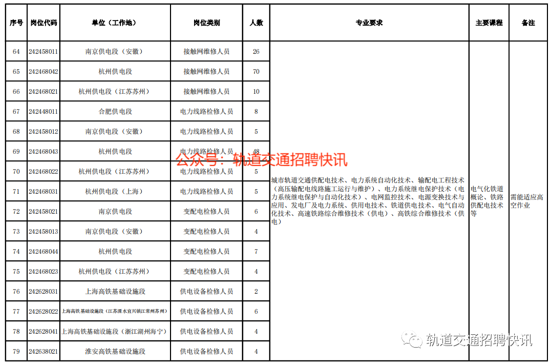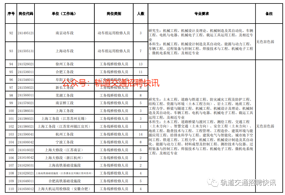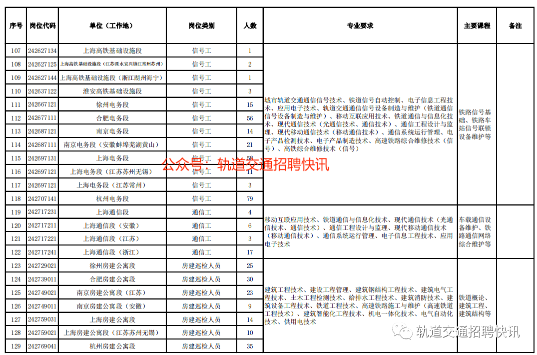 三、招聘流程 招聘流程按以下环节进行:网上报名、审核筛选、考试考核、公示录用等。中国铁路上海局集团有限公司将根据招聘岗位需求分期分批审核筛选毕业生参加考试考核,具体时间、地点及方式另行通知。未进入考试考核环节的毕业生恕不通知。 四、报名方法 提前在教育部学信网下载《教育部学籍在线验证报告》(文件保存为PDF格式,不大于300KB,报名时须上传),于2023年11月8日-2023年12月18日 报名成功后请下载并打印《应届大学生信息登记表》(请务必使用谷歌浏览器注册报名和下载表格,并牢记登录名和密码)。 报名须按照专业对口原则,如报名岗位与所学专业不对口,即为审核不合格,不得进入下一环节。所有信息须由毕业生本人如实填报,如发现填报信息与实际信息不一致的,取消应聘资格。每人限报一个岗位。 五、其他事项 1.拟录用人员在中国铁路人才招聘网或上铁资讯网进行公示。 2.中国铁路上海局集团有限公司不向应聘者收取任何费用,不指定辅导用书,不举办也不委托任何机构举办任何形式的辅导培训班,请提高警惕,谨防社会机构或个人冒名诈骗。 3.应聘毕业生必须保证所提供的联系方式畅通、有效,因通信不畅造成的后果招聘单位不承担责任。 4.请应聘毕业生提前准备好以下资料备用: (1)《应届大学生信息登记表》(网上报名时打印); (2)《教育部学籍在线验证报告》(教育部学信网下载打印);或教育部留学服务中心出具的《国外学历学位认证书》(归国留学生提供); (3)《就业推荐表》原件(须学校盖章)和复印件; (4)《成绩单》原件(须学校盖章)和复印件; (5)身份证原件和复印件; (6)外语、计算机能力证书原件和复印件;奖学金证书、获奖证书、荣誉称号证书、职业资格证书等证明本人资历能力的材料原件和复印件; (7)《体检报告》原件和报告结论页复印件(六个月之内,二级甲等及以上医院常规项目体检,血压、辨色力、视力、听力、心电图、胸片、血常规、尿常规、肝功能、肾功能为必检项目); (8)《普通高等院校毕业生就业协议书》原件(须学校盖章)和复印件。如所在学校采取网络方式签约的,须打印应聘时本人签约账户内签约状态截屏图片。 5.中国铁路上海局集团有限公司人事部保留对本公告及附件最终解释权。 6.咨询电话:021-51222191,51225731; 咨询时间:工作日13:30-17:00。 中国铁路上海局集团有限公司人事部 2023年11月8日 2757人!中国铁路上海局集团有限公司 招聘2024年毕业生公告二(高等职业院校) 中国铁路上海局集团有限公司根据企业发展需要,拟招聘应届全日制普通高等职业院校高职(大专)毕业生,现将具体事项公告如下: 一、招聘岗位代码、单位、岗位类别、人数、专业要求及主要课程(见附件) 二、招聘条件 1.2024年毕业,列入国家招生计划的应届全日制普通高等职业院校高职(大专)毕业生。2023届离校未就业毕业生以应届毕业生身份参加应聘。 2.遵纪守法,品行端正,热爱铁路事业;素质能力适应招聘岗位工作要求,能够适应铁路沿线偏远地区、野外作业及长期夜班工作。 3.具有良好的心理素质,无色盲色弱,身体健康,符合招聘岗位职业健康规范标准。 4.符合招聘岗位要求的学历、专业等条件,所学专业为铁路专业方向,所学课程包含铁路专业课程,未与任何单位签订就业协议。 5.工作单位所在地生源优先。