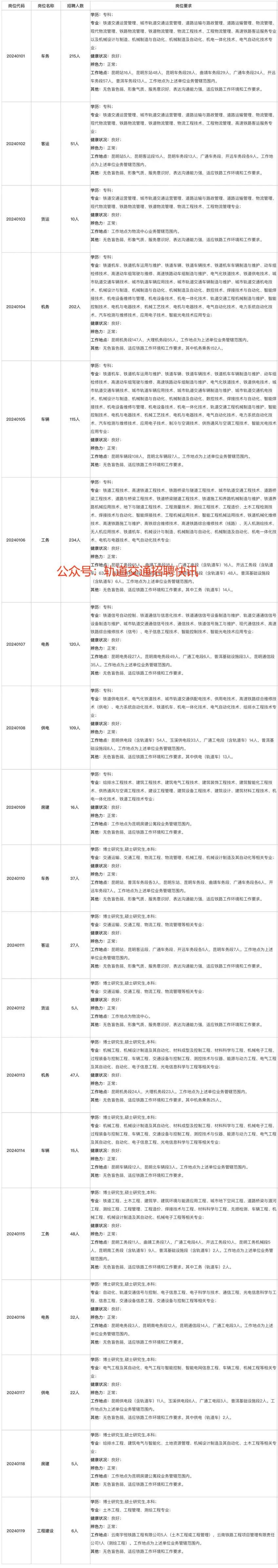 三、招聘流程 (一)网络报名。本次招聘只接受网上报名,应聘毕业生可通过 进行报名,完整填写本人基本信息,并上传教育部学籍在线验证报告(登陆中国学信网www.chsi.com.cn,按提示生成)。每位应聘毕业生按所学专业报名的招聘岗位仅限一个。 报名时间:2023年11月17日至2024年3月31日。 (二)审核筛选。根据岗位需要、报名情况以及学校生源和教学质量,分期、分批审核筛选应聘人员的有关资料,择优确定应聘毕业生参加考试考核。 (三)考试考核。应聘毕业生按照中国铁路人才招聘网站发送的站内消息或电话通知,在指定的时间、地点参加考试考核。24021-24023岗位采取“笔试+面试”考核方式,其他岗位采取面试考核方式。 毕业生应递交以下资料: 1.中国铁路人才招聘网下载打印的《毕业生应聘登记表》(需本人签名); 2.《教育部学籍在线验证报告》,2023年毕业的毕业生还需提供毕业证和学位证复印件; 3.毕业生就业推荐表、就业协议书原件、在校所学全部学科的成绩单原件并加盖公章; 4.身份证原件及复印件; 5.二级甲等及以上医院,近六个月的体检报告(要求有检查结论),必检项目为血压、辨色力、视力、听力、心电图、胸片、腹部B超、血常规、尿常规、肝功能、肾功能; 6.各类获奖证书及其他能够证明本人资历或能力材料的原件及复印件。 (四)公示。根据考核结果择优确定拟录用人员,通过中国铁路人才招聘网进行公示。在各招聘环节中,对采取面试考核方式招录岗位未能进入下一环节的应聘毕业生不再另行通知,敬请谅解。 四、其他事项 (一)本次招聘只接受应聘人员本人网络报名,无其他报名方式,不接受邮寄、他人代交简历。 (二)应聘人员应确保注册使用的邮箱及联系电话正常使用,因通信不畅等原因导致未按要求参加应聘的,视为个人自动放弃。 (三)应聘人员应保证有关报名信息和所提交应聘材料的真实性,一经发现弄虚作假,立即取消应聘资格。 (四)本次招聘未委托第三方招聘,也不向应聘人员收取任何费用,请提高警惕,谨防受骗。 (五)中国铁路青藏集团有限公司保留对招聘公告及相关规定的最终解释权。(六)报名咨询电话:0971-7192757咨询时间:工作日上午09:00-11:30 下午15:00-17:30。 中国铁路青藏集团有限公司人事部 2023年11月17日 1061人!中国铁路青藏集团有限公司 2024年招聘全日制普通高校大专(高职)毕业生公告(二) 根据运输生产工作需求,中国铁路青藏集团有限公司拟招聘2024年全日制普通高校大专(高职)毕业生,现将具体事宜公告如下: 一、招聘计划 招聘岗位信息详见岗位信息表。 二、招聘条件及要求 (一)遵纪守法,品行端正,热爱铁路事业。 (二)符合招聘岗位要求的专业条件,列入国家招生计划,2024年和2023年毕业的全日制普通高等院校大专(高职)学历毕业生。在校期间所学专业为铁路方向或所学主要课程中包含铁路专业课程。 (三)身心健康,具有正常履行岗位职责的身体条件,符合铁路行业职业健康检查规范。(四)服从集团公司对岗位的安排和调整,能够适应集团公司管内高原气候和沿线艰苦地区工作环境及夜班作业。