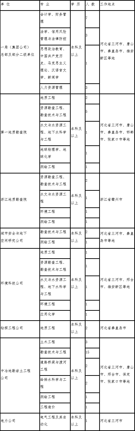 点击上方名片关注“燕赵国企好工作”,查看河北省国企最新招聘信息。建议置顶标星~有疑问,请加微信:hbrsksw7。如需交流,请加QQ群:546471140。 中国冶金地质总局一局(中冶一局集团有限公司)2024年度高等院校应届毕业生招聘64人公告中国冶金地质总局一局(中冶一局集团有限公司)(以下简称“一局(集团公司)”)是中国冶金地质总局直属中央企业,始建于1974年,注册地在北京东燕郊,主要从事地质勘查、工程施工、城市地质、地下空间开发利用、环境检测治理等业务。单位详细情况,请登录一局(集团公司)及二级单位网站了解。点击查看更多招聘信息 根据一局(集团公司)生产经营需要,结合实际用工需求,按照公开、平等、竞争、择优、按需招聘原则,一局(集团公司)拟统一招聘部分专业普通高等院校应届毕业生,现将有关事项公告如下: 一、招聘单位、专业