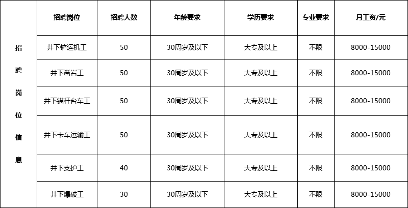 识码加入威海招聘考试群 4.具备大专及以上(或相当)学历,年龄30周岁及以下成年人(1992年12月31日及以后出生)。5.身体健康,无色盲、心脏病、矽肺病(或疑似)、精神病(或家族病史)等井下作业禁忌症(附件3)。6.专业不限,优先考虑具有矿山井下一线工作经验,或机电一体化等相关专业人员。7.本科毕业的应聘人员笔试成绩加5分,专科毕业院校为985或211院校的应聘人员笔试成绩加3分,不累计加分。网上集中报名时间自公告发布之日起至2023年12月31日。应聘者需下载《招聘报名表》(附件2),如实填写后连同相关报名材料、证明材料扫描件或数码照片同步发送到以下指定报名邮箱(请将全部报名材料打包压缩,并在压缩包以及邮件标题中注明“姓名”),其他应聘方式无效。薪酬执行工作单位制度规定,按照规定缴纳五险一金,发放员工福利及津补贴。