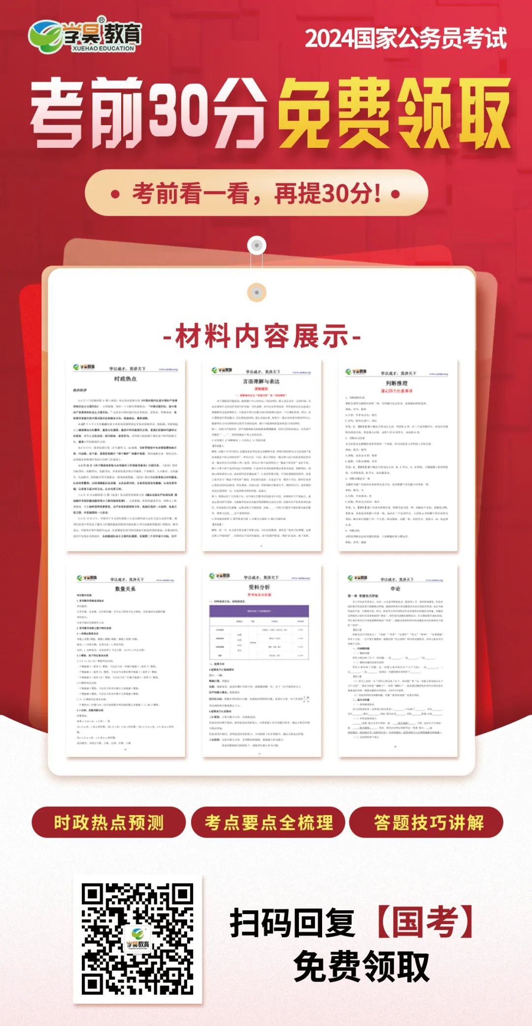 扫码回复【1119】查看公告详情 时政热点预测、考点要点全梳理、答题技巧讲解 考前看一看,还能再提分! 扫码回复【考前】即可免费领取
