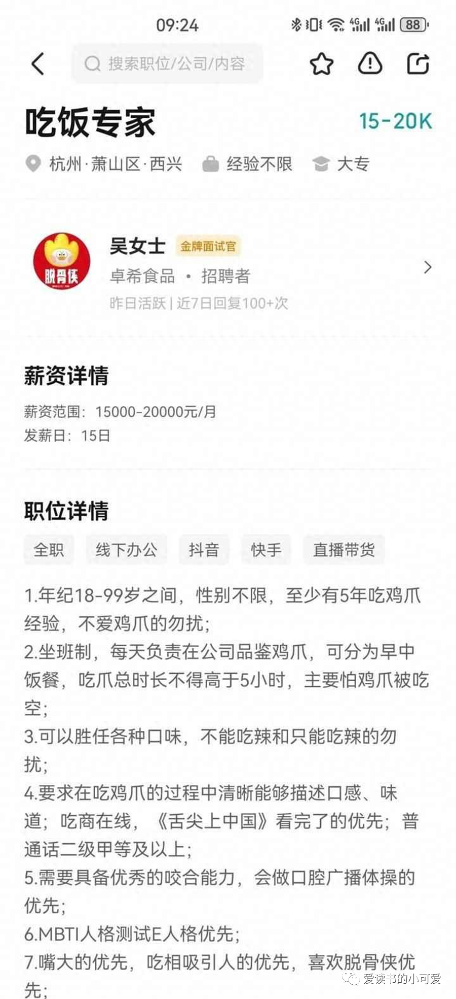 随着社交媒体的兴起,一则令人忍俊不禁的招聘信息在网络上引起热议。据截图显示,一家食品公司正在招聘“吃饭专家”,并承诺月薪1.5万元到2万元。这一职位的奇葩要求令人啼笑皆非,要求应聘者至少有5年吃鸡爪的经验,每天负责在公司品鉴鸡爪,对各种口味了如指掌,但总吃爪时长不得高于5小时。招聘要求对口感、味道有清晰的描述能力,甚至看过《舌尖上的中国》者优先。招聘发布后,吸引了大量网友在招聘app上留言自荐,纷纷表示这份工作简直是为他们量身定制。