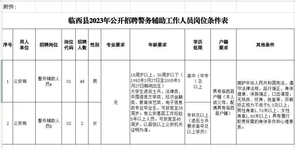 1、本次计划公开招聘警务辅助工作人员共计50名,招聘的岗位、数量和其他条件等具体详见《临西县2023年公开招聘警务辅助工作人员岗位条件表》(附件)。