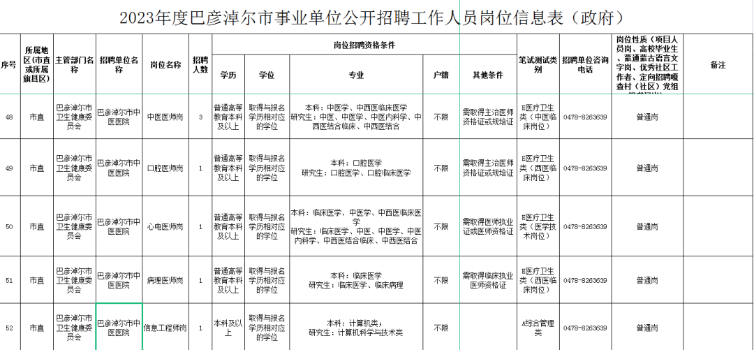 北京中医医院内蒙古医院(巴彦淖尔市中医医院)本次招聘5个岗位,招聘工作人员7人。招聘岗位、资格条件详见《2023年度巴彦淖尔市事业单位公开招聘工作人员岗位信息表(政府)》(序号48-52:巴彦淖尔市中医医院)