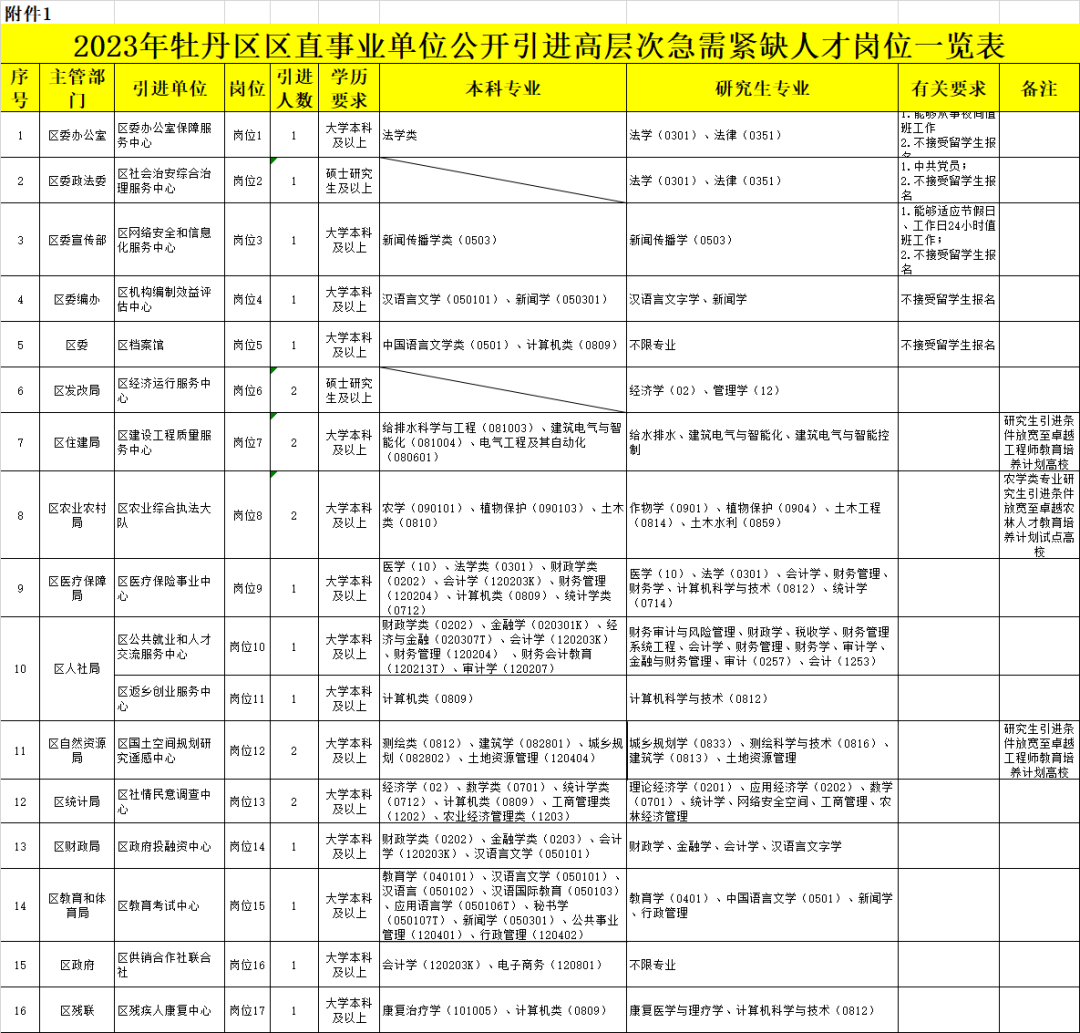 按照《事业单位人事管理条例》(国务院令第652号)、《山东省事业单位公开招聘人员实施办法》(鲁人社规〔2022〕2号)等规定,2023年烟台市牟平区拟公开招聘100名优秀毕业生,进行重点培养。现公告如下:1.管理岗位40名,限大学本科及以上学历毕业生报考。专业要求详见《2023年烟台市牟平区公开招聘优秀毕业生岗位需求表》(附件1),同时应满足以下条件:中共党员(含预备党员),且在大学本科或研究生期间担任过校(院系)学生会(研究生会)主席、副主席、秘书长或班长、团支书满1年(入党时间、任职时间均截至2023年3月20日)。2.专业技术岗位60名,限硕士研究生及以上学历毕业生报考。专业要求详见附件1,需同时满足相关报考条件。报名时间:2023年3月20日9:00—3月29日17:00;查询时间:2023年3月20日12:00—3月30日17:00;缴费时间:2023年3月20日12:00—3月31日17:00。报名网址:网上报名系统 (chinasyks.org.cn)为加大优秀年轻干部储备力度,优化干部人才队伍结构,按照《事业单位人事管理条例》(国务院令第652号)等规定,烟台市蓬莱区拟从大学本科及以上优秀高校毕业生(不含定向培养生、委托培养生)中,分类考选50名事业单位工作人员,进行重点培养。现公告如下:报名时间:2023年3月20日8:30—3月24日17:00初审时间:2023年3月20日8:30—3月25日12:00确认时间:2023年3月20日8:30—3月28日17:00为做好山东省气象局2023年度事业单位公开招聘普通高校应届毕业生招聘工作,根据中国气象局批复的招聘计划,按照《气象部门事业单位公开招聘应届高校毕业生管理办法(试行)的通知》(气发〔2015〕53号)等有关规定,现将本批次招聘公告如下:山东省气象部门2023年度公开招聘国家气象系统事业编制非气象类毕业生18人,其中研究生岗位8人,本科岗位10人。具体信息详见《山东省气象局2023年度事业单位招聘本科以上毕业生需求信息明细表(非气象类岗位)》(附件1)。(二)遵纪守法,品行端正,愿意履行事业单位人员的义务;(一)报名:登录气象人才招聘系统注册报名。报名时间从发布公告起至2023年3月24日,非报名时间段内收到的报名材料不予受理。每人限报1个岗位,注明是否服从调剂。报名人员按最高学历的专业报考,可报考同学历层次及以下学历层次的岗位。(二) 资格审查:山东省局人事处负责资格审查工作。根据应聘考生提交的信息资料,对考生进行资格审查。应聘毕业生填写的报名信息必须真实、全面、准确。对主要信息(如所学专业等)填报不实的,按弄虚作假处理;对填报不全、格式不规范导致未通过资格审查的,责任自负;对提交信息不全、内容不规范的,不予审核。应聘考生恶意发送报考信息、扰乱报名秩序的,一经查实,取消报考资格。(三)笔试、面试:笔试由第三方考试机构组织实施,考试种类为山东省事业单位公开招聘工作人员综合类考试,考试内容为公共基础知识。根据笔试成绩,按每个岗位1:3的比例确定参加面试人选,对于最后1名笔试成绩出现并列者,则均确定为面试人选。笔试时间拟定于2023年3月31日在济南进行,面试时间拟定在2023年4月中旬进行。具体事宜请关注山东省气象局官网、气象人才网公告。2023菏泽市牡丹区区直事业单位公开引进高层次急需紧缺人才公告(22人)