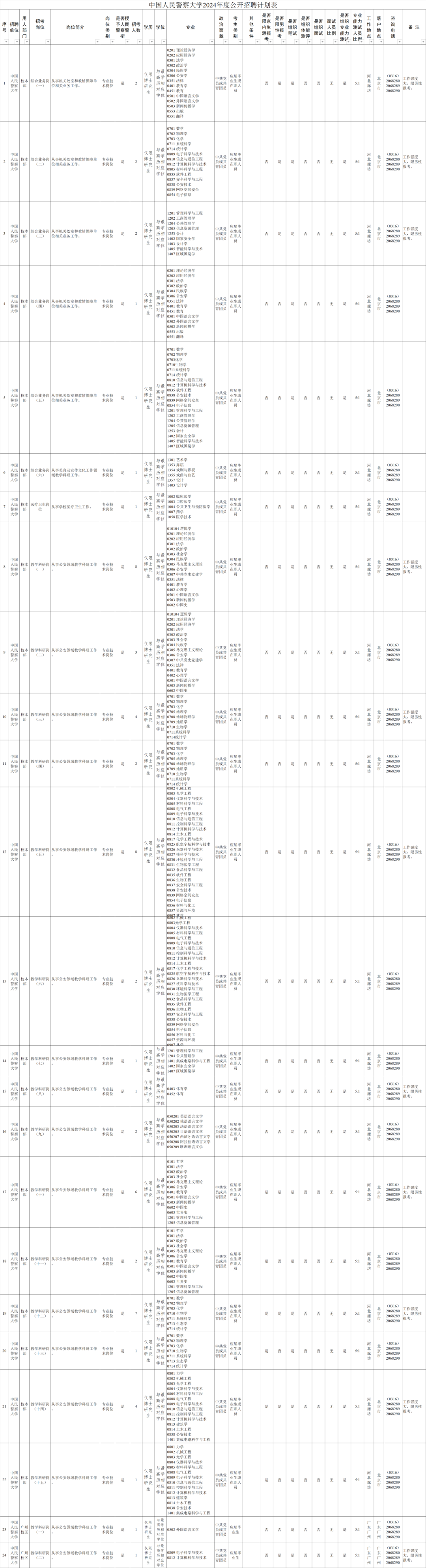 本次招聘共设置24个公开招聘职位、招聘64人,均为人民警察职位,要求学历为博士研究生。具体职位信息及资格条件详见《中国人民警察大学2024年度公开招聘计划表》(见附件)。