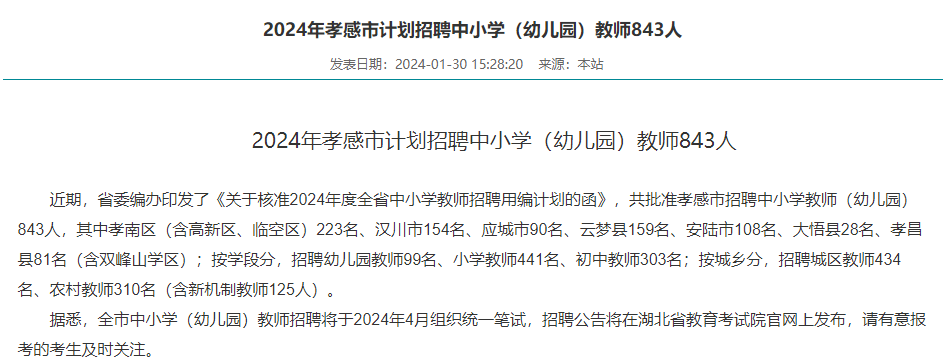 近期,省委编办印发了《关于核准2024年度全省中小学教师招聘用编计划的函》,共批准孝感市招聘中小学教师(幼儿园)843人,其中孝南区(含高新区、临空区)223名、汉川市154名、应城市90名、云梦县159名、安陆市108名、大悟县28名、孝昌县81名(含双峰山学区);按学段分,招聘幼儿园教师99名、小学教师441名、初中教师303名;按城乡分,招聘城区教师434名、农村教师310名(含新机制教师125人)。