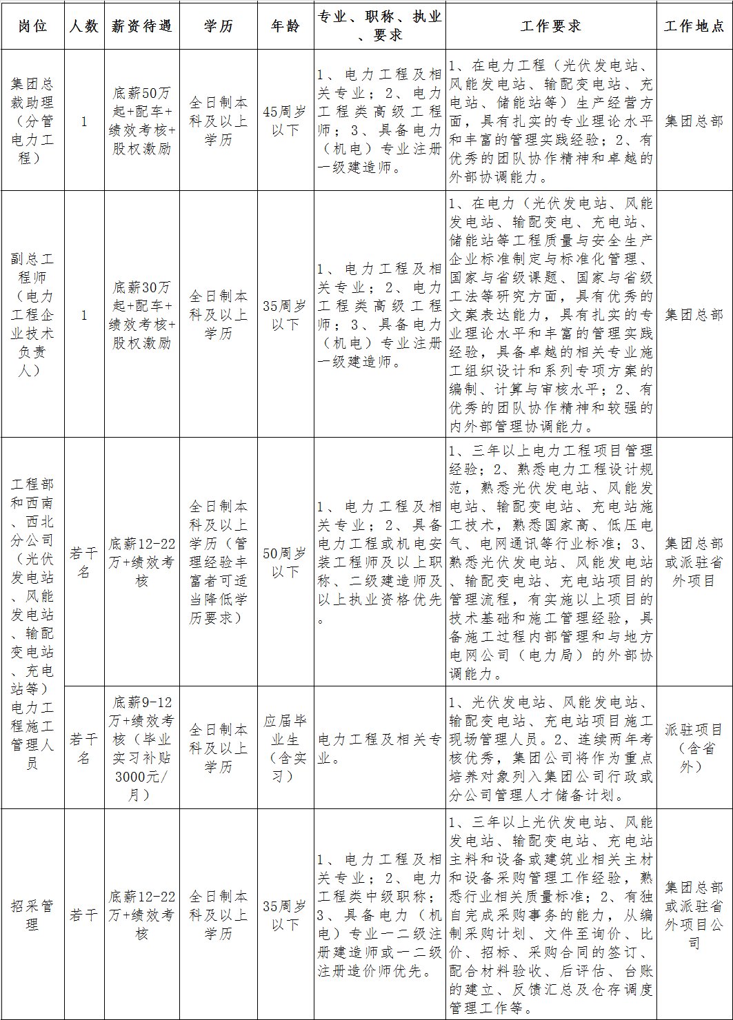 公司秉承“德才兼备、以德为先、任人唯贤”的人才培养与管理者任用理念,以打造灵活应变的内部超级流动性组织与区域性大型卓越现代建筑业企业为目标,诚聘省内外英才。应聘者应具备孝敬父母、尊敬师长、友爱亲朋、热爱生活、正直善良、诚实守信的价值观,懂感恩、负责任、重气节!恪守职业道德、珍惜个人与公司声誉,有不积跬步无以致千里的实干、奋斗与创新精神,有不辞细壤故能成其高的担当、协作与奉献精神,与公司同成长、共荣辱。公司热忱欢迎省内外优秀学子和电力业英才加盟,公司将为您提供一个施展才华、实现价值的平台,成为一名受人尊敬的工程师、项目经理或职业经理人。让我们携手共建美好家园!