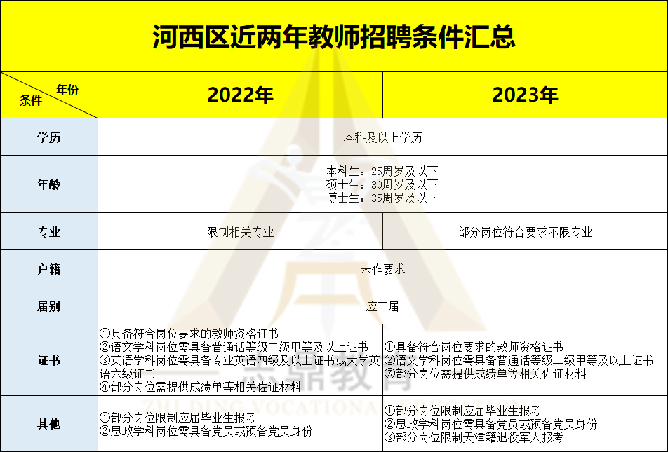 上图为近两年河西区教招条件对比,从图中我们可以看到: