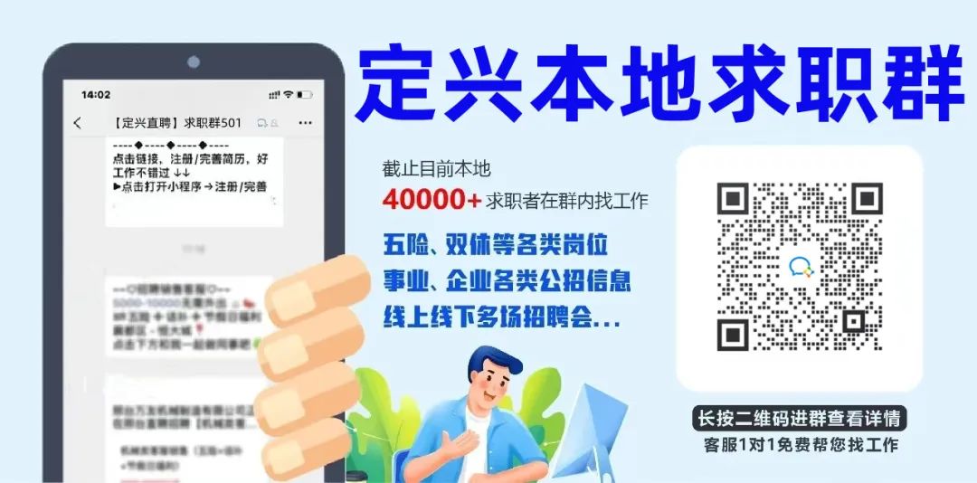 售后服务专员5000-12000元/月周末双休 | 节日福利 | 免费培训 | 晋升空间 | 年度旅游 | 定期体检 | 五险企业名称:中国人寿公司地址:河北省保定市定兴县南堤路工作要求:岗位要求: 诚信,健康,具有良好的沟通和语言表达能力及服务心态,不甘平庸,勇于挑战,勇于开拓,热爱寿险事业及售后服务工作! 待遇:享有公司免费提供的客户资源,工资+奖金+佣金+津贴 +养老和医疗保险 面试安排 学历要求:中专或以上学历...长按识别二维码,了解更多莱尼线束车间普工(10天一发工资)6000-6500元/月提供食宿 | 工作餐 | 免费培训企业名称:保定智人力公司地址:保定智财优人力资源高碑店市分公司-河北省保定市高碑店市兴安路悦都工作要求:廊坊三河莱尼线束 厂区吃住,免费体检,免费工作餐! 上班可以带手机 烟疤纹身看不到就好 年龄:16-47周岁男女不限! 工期:可以长期干 工资待遇:培训期工资:100 元/天,培训 3 天,总计 300 元 白班:210 元/天11小时 夜...长按识别二维码,了解更多西麦食品招聘:普工、操作机手、生产班长、临时工5000-6000元/月提供食宿 | 加班补助 | 节日福利 | 工作餐 | 免费培训 | 晋升空间 | 定期体检企业名称:河北西麦食品有限公司公司地址:定兴县工业园区南环路西段河北西麦食品有限公司南门工作要求:岗位一:车间操作工30名 要求:年龄20-49周岁,男女不限,身体健康无传染病,初中以上学历,能适应长白班加班。计件工资,免费提供吃住,有全勤奖励。 岗位二:车间临时工20名 要求:年龄18-50周岁,工作时间8小时,自愿加班,身体健康无...长按识别二维码,了解更多车工(5000-6000元)5000-6000元/月工作餐企业名称:保定诚信辊业有限公司公司地址:河北省保定市定兴县容固路10号工作要求:1、根据工作需要及上级的安排,操作普通车床(以车床为主,完成日常维修、模具制作、及新设备制造等加工件的加工,满足生产需要; 2、根据上级安排,落实工作区域内安全、消防和“5S”工作,保证安全生产。 任职资格: 1、高中/中专以上,机械加工类...长按识别二维码,了解更多车间班组长4000-5000元/月提供食宿 | 节日福利 | 带薪年假 | 工作餐 | 年终奖 | 免费培训 | 晋升空间 | 五险企业名称:河北西麦食品有限公司公司地址:定兴县工业园区南环路西段河北西麦食品有限公司南门工作要求:岗位职责: 1、执行生产管理规范要求根据车间生产计划安排生产,确保生产计划达成; 2、落实“7s”管理要求,维护生产现场基础设施和工作环境,确保安全文明生产作业; 3、协调生产所需物料、人员,执行产品的生产任务; 4、每天召开车间例...长按识别二维码,了解更多生产车间机手4000-5000元/月提供食宿 | 节日福利 | 晋升空间 | 免费培训 | 工作餐企业名称:河北西麦食品有限公司公司地址:定兴县工业园区南环路西段河北西麦食品有限公司南门工作要求:要求男性,25-35周岁之间,高中/中专及以上学历,机电一体化或者机械维修等相关专业,能够适应12小时黑白班倒。主要负责车间机械的正常运转监督维护。长按识别二维码,了解更多车间普工/码垛工20名3000-5500元/月提供食宿 | 节日福利 | 晋升空间 | 免费培训企业名称:河北西麦食品有限公司公司地址:定兴县工业园区南环路西段河北西麦食品有限公司南门工作要求:河北西麦食品有限公司诚聘: 生产工人20名 要求:18-46周岁,男女不限,身体健康,吃苦耐劳、遵规守纪,能适应加班。 待遇:计件工资,月均薪资3500-5500元,长白班,免费提供食宿,有洗浴和wifi,生日和节假日福利等。 地址:河北保...长按识别二维码,了解更多外圆磨工、车工(5000-6000元)5000-6000元/月工作餐企业名称:保定诚信辊业有限公司公司地址:河北省保定市定兴县容固路10号工作要求:1、了解机械及数控加工知识; ...长按识别二维码,了解更多磨工(5000-6000元)5000-6000元/月工作餐企业名称:保定诚信辊业有限公司公司地址:河北省保定市定兴县容固路10号工作要求:1、了解机械及数控加工知识; ...长按识别二维码,了解更多财务面议工作餐企业名称:保定诚信辊业有限公司公司地址:河北省保定市定兴县容固路10号工作要求:1、负责日常收支管理和核对; 2、主要就是公司的一些简单的内账; 3、认真核对并确认客户的每一笔回款,做好客户回款的审核确认工作,编制收款会计凭证并登记应收帐款明细帐; 4、每月提供上月客户回款计划执行情况及本月回款计划统计表,每月向部门主...长按识别二维码,了解更多长白班普工3000-4000元/月工作餐企业名称:保定诚信辊业有限公司公司地址:河北省保定市定兴县容固路10号工作要求:招聘车间普工,长白班,上保险,工资3000-4000元每月; 18-45周岁长按识别二维码,了解更多会计3500-6000元/月提供食宿 | 工作餐 | 五险 | 加班补助 | 节日福利 | 免费培训 | 定期体检 | 年度旅游企业名称:河北海虹塑料制品有限公司公司地址:河北海虹塑料制品有限公司(定兴镇新国道大街南段99号)工作要求:岗位职责: 1、负责报销票据审核; 2、负责记账、报表等编制; 3、负责成本核算; 4、负责工资核算; 5、负责仓库盘点; 6、负责提供政府或银行等所需资料; 任职要求: 1、沟通能力强,服从领导安排; 2、具有团队协作能力。长按识别二维码,了解更多车间机手4000-4500元/月提供食宿 | 工作餐 | 五险 | 带薪年假 | 加班补助 | 节日福利 | 免费培训 | 晋升空间 | 定期体检企业名称:河北海虹塑料制品有限公司公司