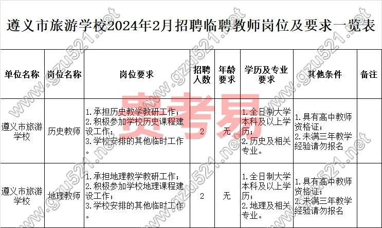 遵义市旅游学校2024年2月教师招聘公告
