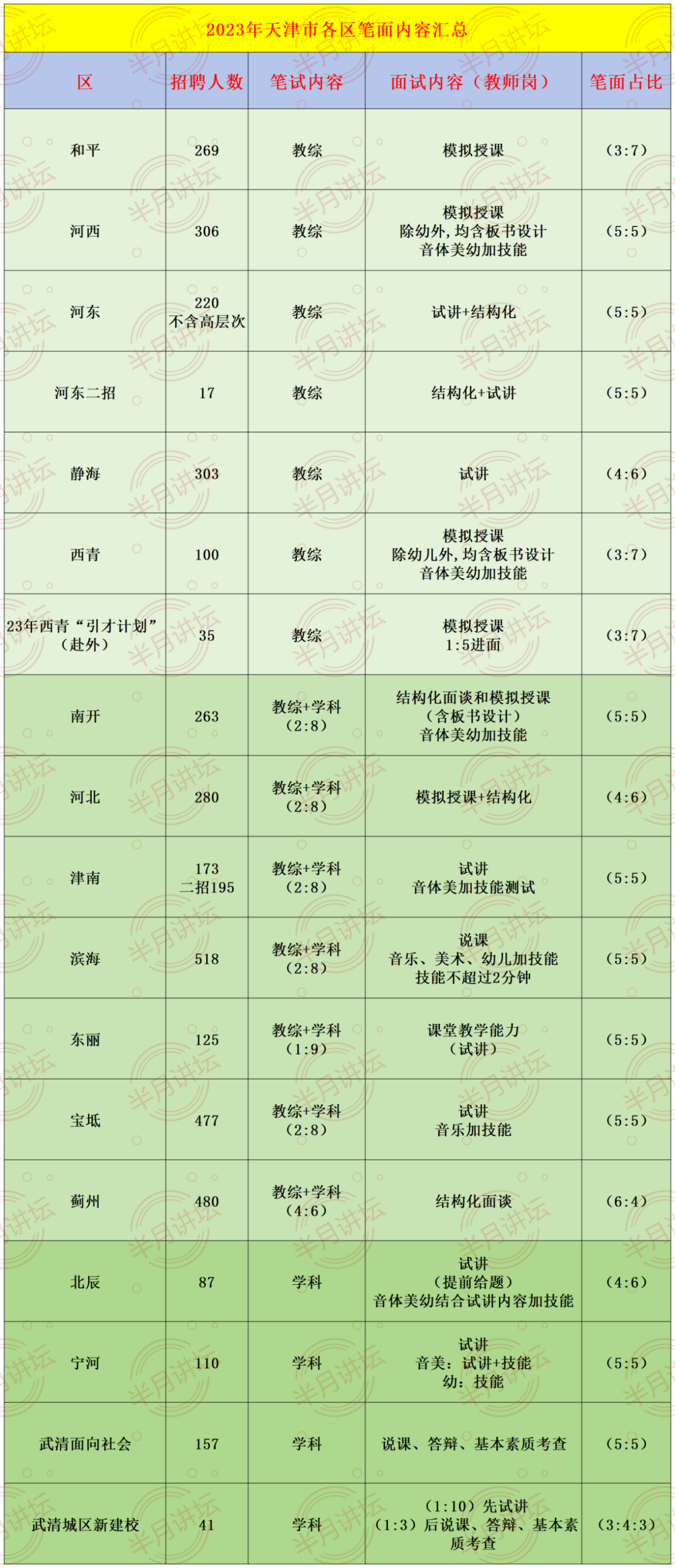 2023年笔试只考教综的区有:河西区、河东区、和平区、西青区、静海区。笔试只考学科的区有:宁河区、北辰区、武清区。