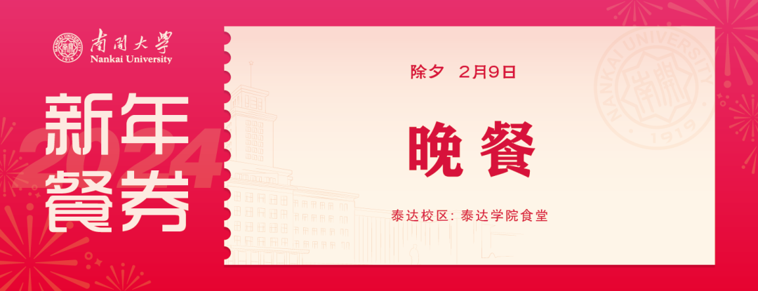 包含现场发放餐券和礼包自提券,自提券请按照使用要求在两校区校内物美超市使用。餐券共计5张,除夕午餐至初二晚餐在学校食堂可用。