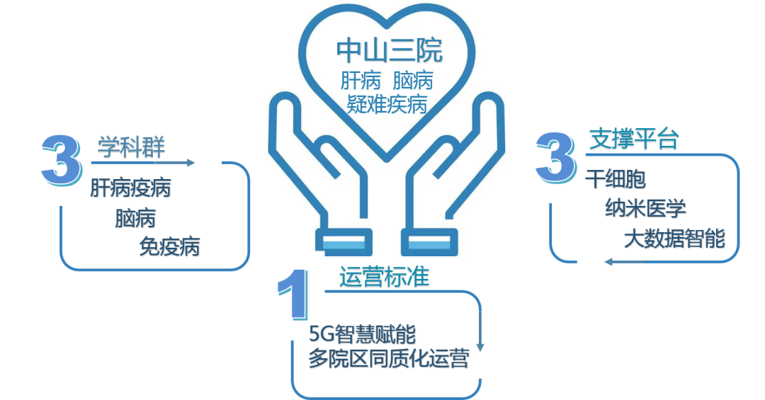 医院始终坚持以病人为中心,聚力三大学科群(肝病、脑病、免疫性疾病)、三大平台(干细胞、纳米、大数据)、一个标准(5G赋能多院区运营模式),全面推进高质量发展,已形成看肝病、看脑病、看疑难杂症到中山三院的良好口碑。
