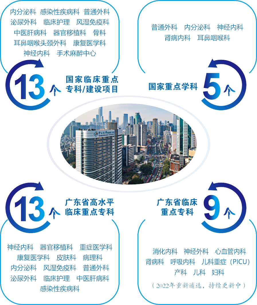 中山三院涵盖齐全的学科门类,拥有5个国家重点学科、13个国家临床重点专科建设项目、13个广东省高水平临床重点专科、9个广东省临床重点专科。