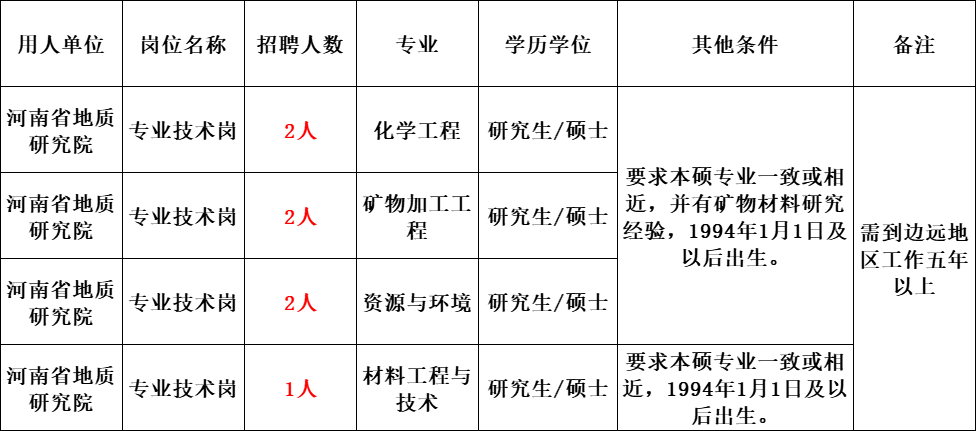 6. 具备应聘岗位所需要的其他具体条件,详见《河南省地质研究院公开招聘岗位信息表》(附件)。