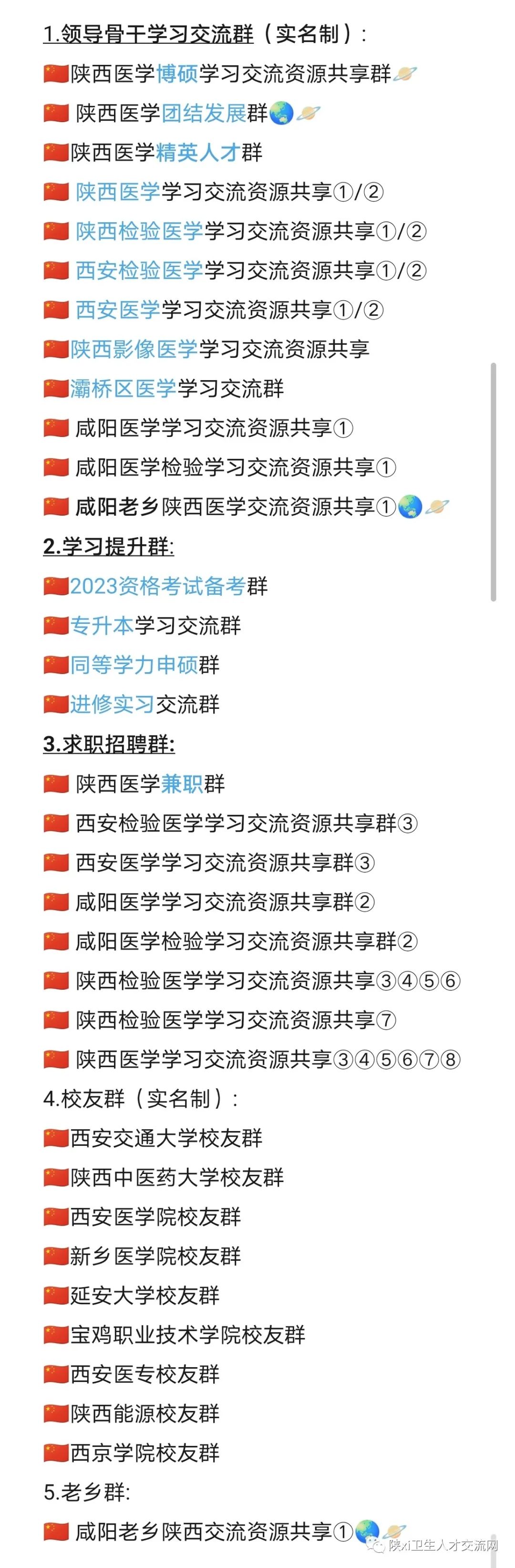 按专业、功能分为:医学综合、检验、影像、博硕生、三甲医院、咸阳老乡群、兼职群、求职招聘群、学习交流群;