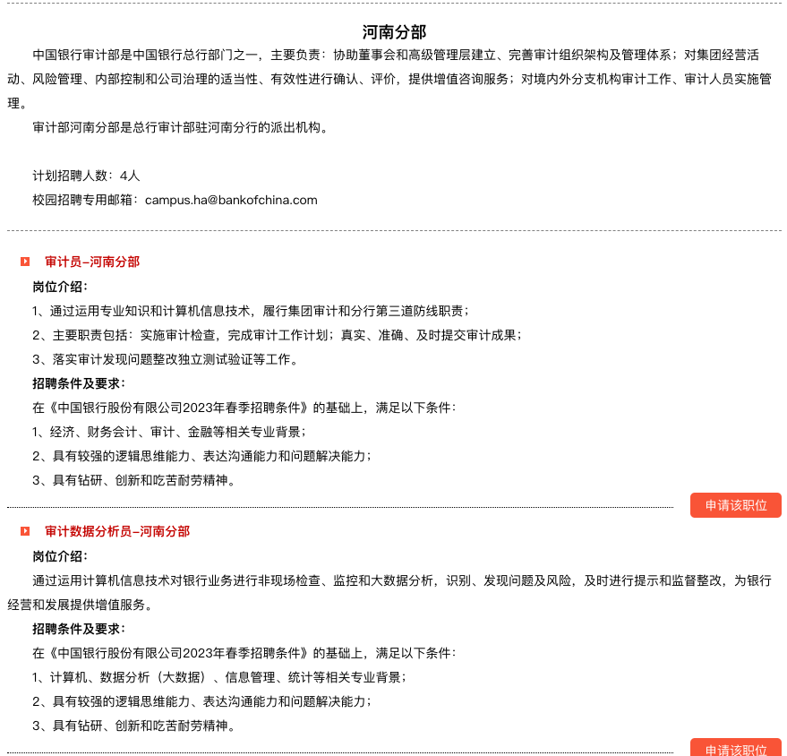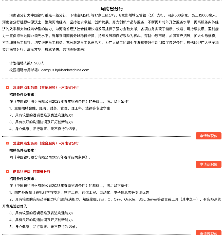 根据业务发展需要,中国银行启动2023年春季招聘,相关信息公告如下: